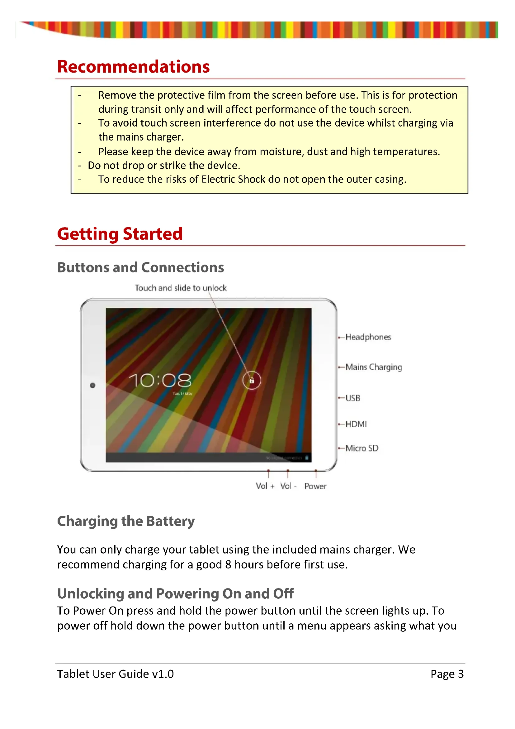 Tablet User Guide v1.0 Page 18Troubleshooting Resetting your device to Factory Defaults If you need to reset your device to the factory default settings for any reason please follow the process below: WARNING!!! Please be aware any information currently on the device will be permanently erased by following this procedure.