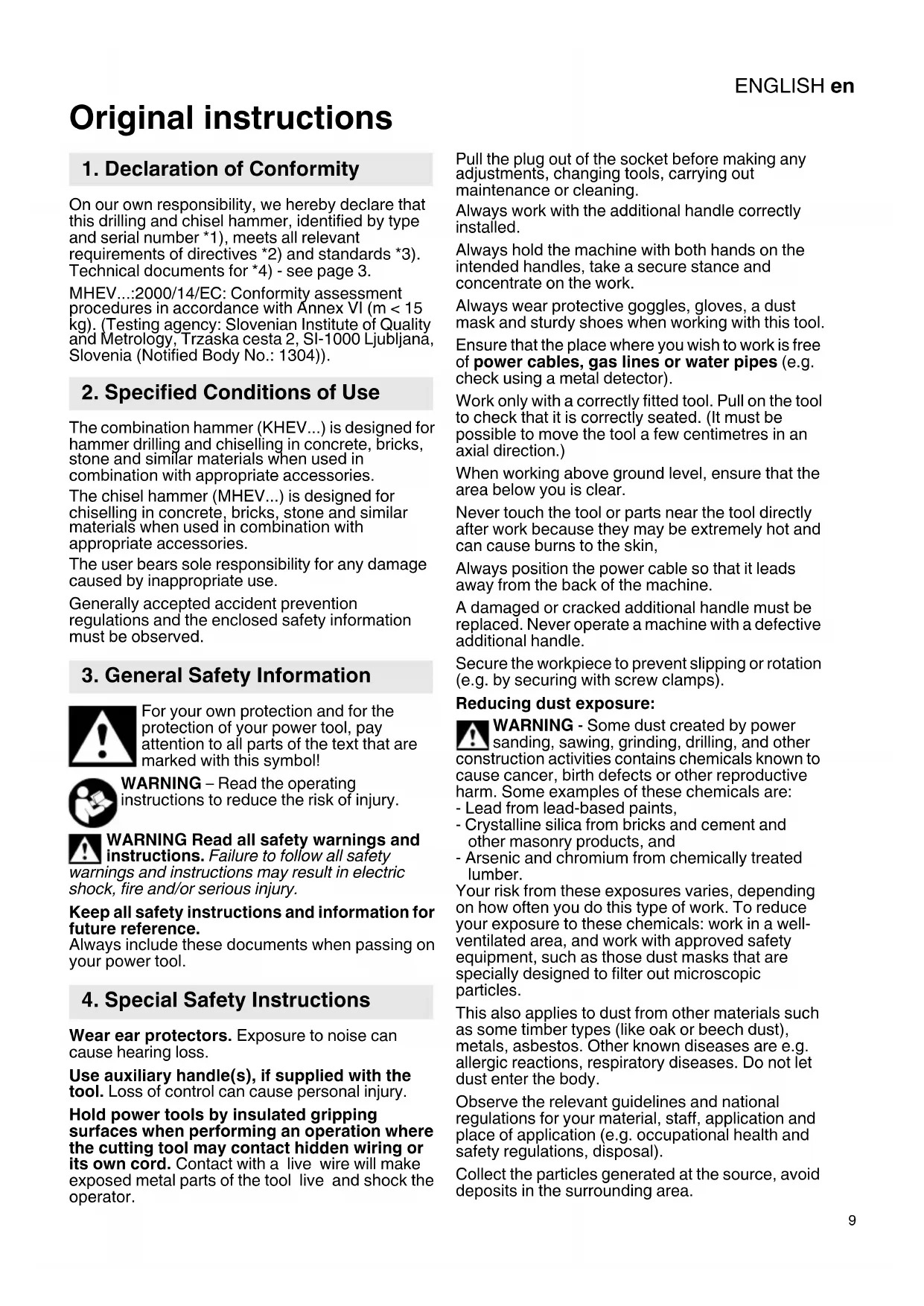 Original instructions On our own responsibility, we hereby declare that this drilling and chisel hammer, identified by type and serial number *1), meets all relevant requirements of directives *2) and standards *3). Technical documents for *4) - see page 3. MHEV...:2000/14/EC: Conformity assessment procedures in accordance with Annex VI (m < 15 kg). (Testing agency: Slovenian Institute of Quality and Metrology, Trzaska cesta 2, SI-1000 Ljubljana, Slovenia (Notified Body No.: 1304)). The combination hammer (KHEV...) is designed for hammer drilling and chiselling in concrete, bricks, stone and similar materials when used in combination with appropriate accessories. The chisel hammer (MHEV...) is designed for chiselling in concrete, bricks, stone and similar materials when used in combination with appropriate accessories. The user bears sole responsibility for any damage caused by inappropriate use. Generally accepted accident prevention regulations and the enclosed safety information must be observed. For your own protection and for the protection of your power tool, pay attention to all parts of the text that are marked with this symbol! WARNING – Read the operating instructions to reduce the risk of injury. WARNING Read all safety warnings and instructions. Failure to follow all safety warnings and instructions may result in electric shock, fire and/or serious injury. Keep all safety instructions and information for future reference. Always include these documents when passing on your power tool. Wear ear protectors. Exposure to noise can cause hearing loss. Use auxiliary handle(s), if supplied with the tool. Loss of control can cause personal injury. Hold power tools by insulated gripping surfaces when performing an operation where the cutting tool may contact hidden wiring or its own cord. Contact with a live wire will make exposed metal parts of the tool live and shock the operator. Pull the plug out of the socket before making any adjustments, changing tools, carrying out maintenance or cleaning. Always work with the additional handle correctly installed. Always hold the machine with both hands on the intended handles, take a secure stance and concentrate on the work. Always wear protective goggles, gloves, a dust mask and sturdy shoes when working with this tool. Ensure that the place where you wish to work is free of power cables, gas lines or water pipes (e.g. check using a metal detector). Work only with a correctly fitted tool. Pull on the tool to check that it is correctly seated. (It must be possible to move the tool a few centimetres in an axial direction.) When working above ground level, ensure that the area below you is clear. Never touch the tool or parts near the tool directly after work because they may be extremely hot and can cause burns to the skin, Always position the power cable so that it leads away from the back of the machine. A damaged or cracked additional handle must be replaced. Never operate a machine with a defective additional handle. Secure the workpiece to prevent slipping or rotation (e.g. by securing with screw clamps). Reducing dust exposure: WARNING - Some dust created by power sanding, sawing, grinding, drilling, and other construction activities contains chemicals known to cause cancer, birth defects or other reproductive harm. Some examples of these chemicals are: - Lead from lead-based paints, - Crystalline silica from bricks and cement and other masonry products, and - Arsenic and chromium from chemically treated lumber. Your risk from these exposures varies, depending on how often you do this type of work. To reduce your exposure to these chemicals: work in a well- ventilated area, and work with approved safety equipment, such as those dust masks that are specially designed to filter out microscopic particles. This also applies to dust from other materials such as some timber types (like oak or beech dust), metals, asbestos. Other known diseases are e.g. allergic reactions, respiratory diseases. Do not let dust enter the body. Observe the relevant guidelines and national regulations for your material, staff, application and place of application (e.g. occupational health and safety regulations, disposal). Collect the particles generated at the source, avoid deposits in the surrounding area.