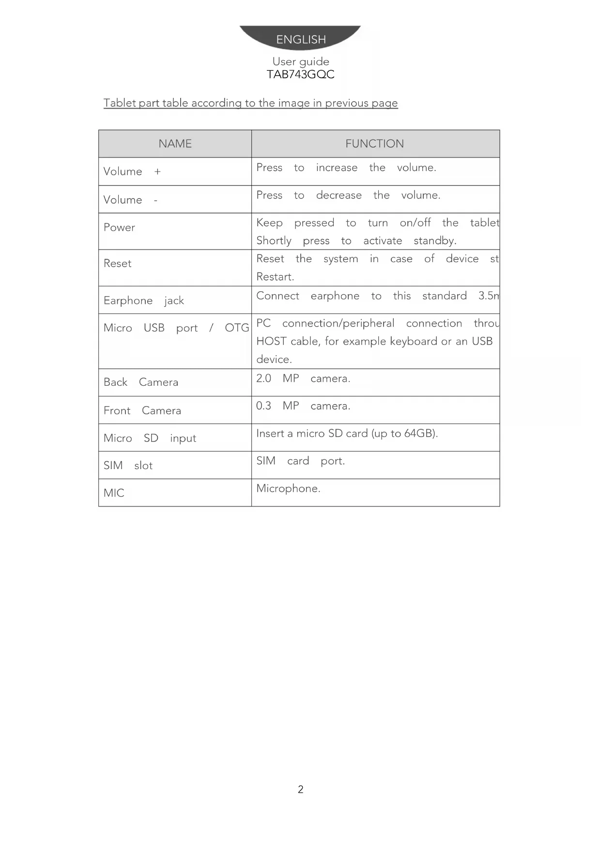 User guide TAB743GQC ENGLISHTablet part table according to the image in previous page NAME FUNCTION Volume + Press to increase the volume. Volume - Press to decrease the volume. Power Keep pressed to turn on/off the tablet. Shortly press to activate standby. Reset Reset the system in case of device stuck and Restart. Earphone jack Connect earphone to this standard 3.5mm jack. Micro USB port / OTG port PC connection/peripheral connection through HOST cable, for example keyboard or an USB device. Back Camera