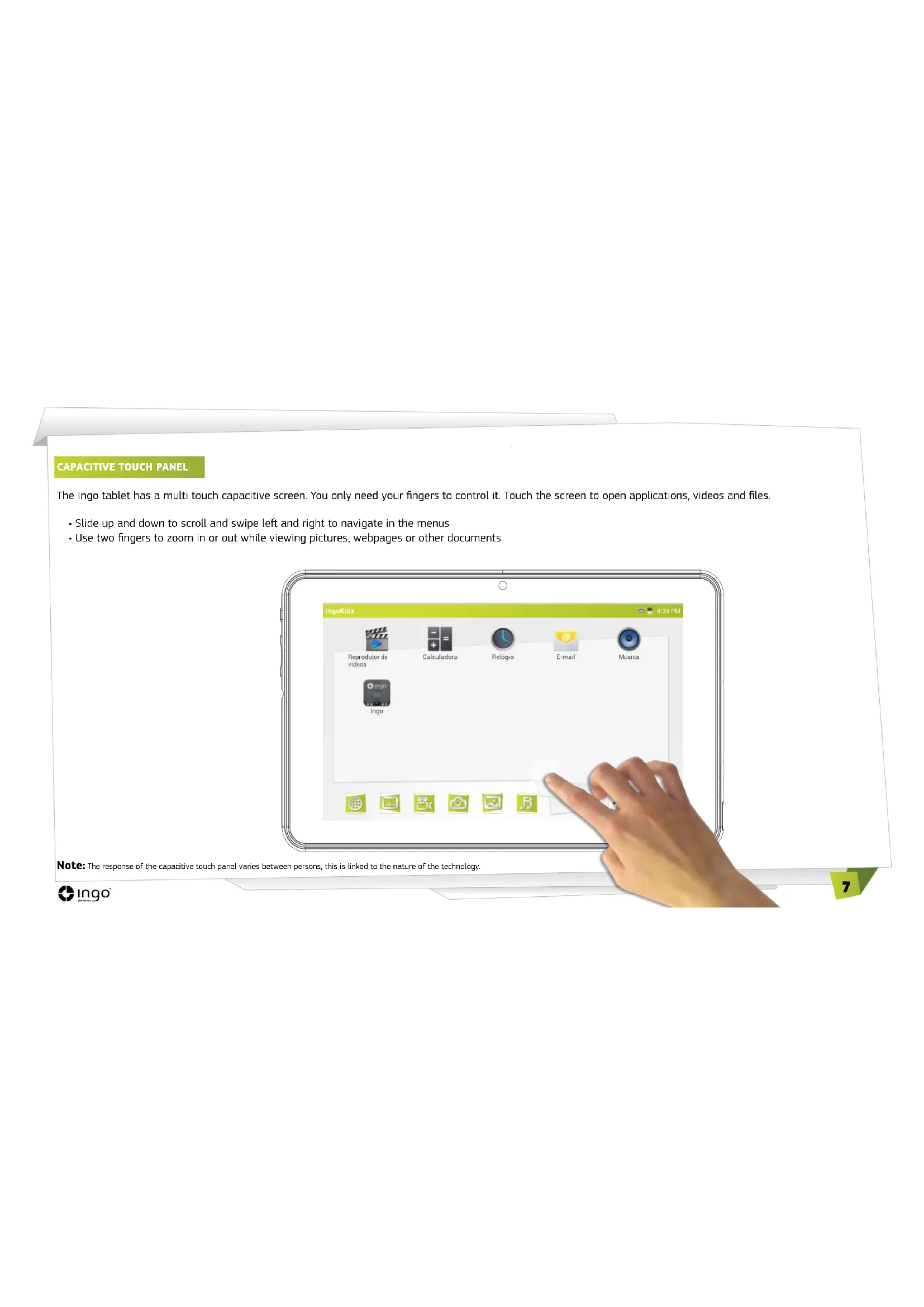 2.Open lock icon7 CAPACITIvE TOUCh PANEL The Ingo tablet has a multi touch capacitive screen. You only need your ngers to control it. Touch the screen to open applications, videos and les.