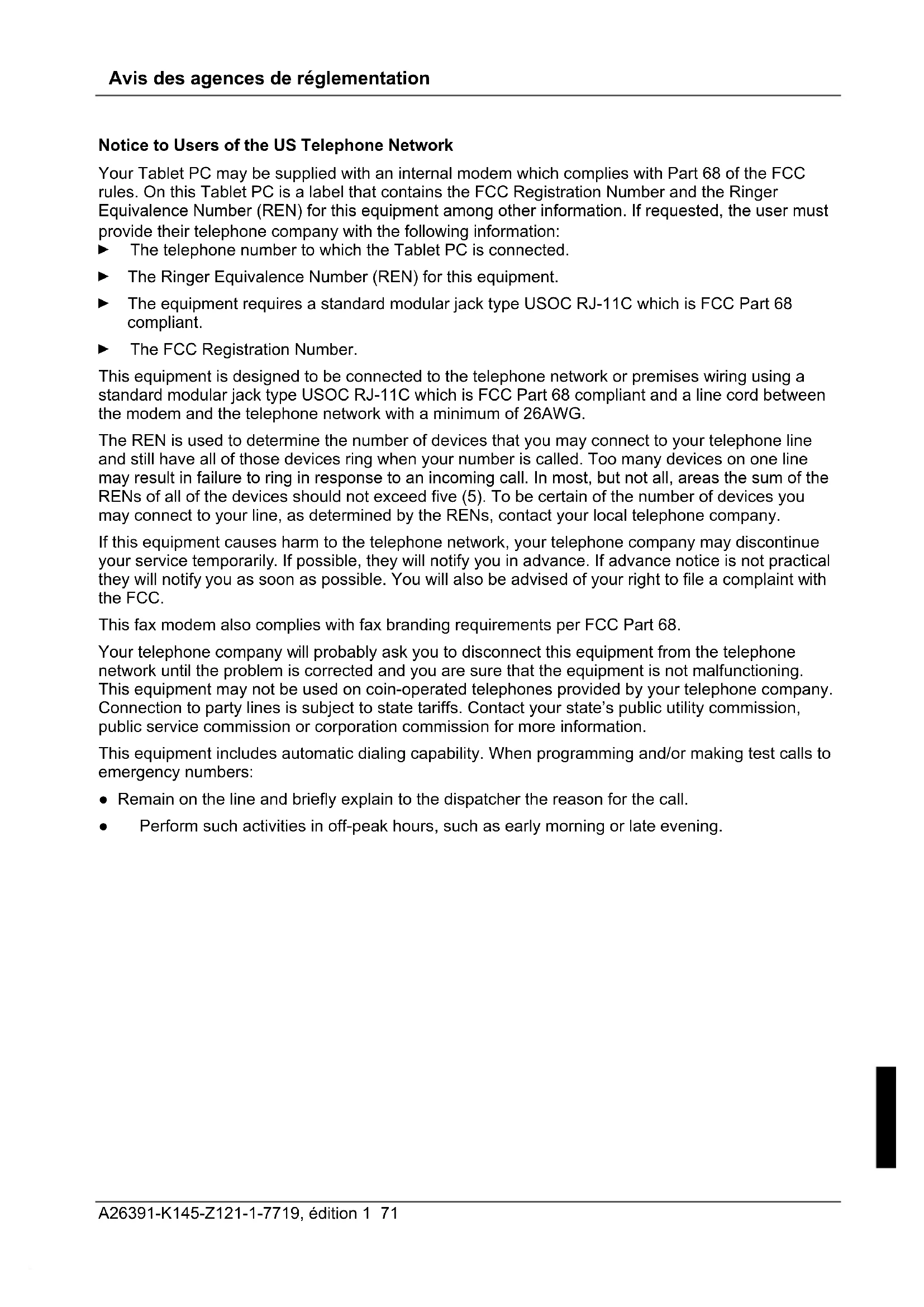If there is no FCC logo and also no FCC ID on the device then this device is not approved by the Federal Communications Commission (FCC) of the USA. Although it is not explicitly forbidden to travel the US trading area carrying this device, but to avoid trouble at customs clearance Fujitsu Siemens Computers GmbH recommends not to bring this device into the US trading area. Regulatory information for Tablet PCs without radio device NOTICE: Changes or modifications not expressly approved by Fujitsu Siemens Computers could void this user’s authority to operate the equipment. Notice to Users of Radios and Television These limits are designed to provide reasonable protection against harmful interference in a residential installation. This equipment generates, uses, and can radiate radio frequency energy and, if not installed and used in accordance with the instructions, may cause harmful interference to radio communications. However, there is no guarantee that interference will not occur in a particular installation. If this equipment does cause harmful interference to radio or television reception, which can be determined by turning the equipment off and on, the user is encouraged to try to correct the interference by one or more of the following measures: ● Reorient or relocate the receiving antenna. ● Increase the separation between the equipment and receiver. ● Connect the equipment into an outlet that is on a different circuit than the receiver. ● Consult the dealer or an experienced radio/TV technician for help. Shielded interconnect cables must be employed with this equipment to ensure compliance with the pertinent RF emission limits governing this device.Avis des agences de réglementation A26391-K145-Z121-1-7719, édition 1 71 Notice to Users of the US Telephone Network Your Tablet PC may be supplied with an internal modem which complies with Part 68 of the FCC rules. On this Tablet PC is a label that contains the FCC Registration Number and the Ringer Equivalence Number (REN) for this equipment among other information. If requested, the user must provide their telephone company with the following information: Ê The telephone number to which the Tablet PC is connected. Ê The Ringer Equivalence Number (REN) for this equipment. Ê The equipment requires a standard modular jack type USOC RJ-11C which is FCC Part 68 compliant. Ê The FCC Registration Number. This equipment is designed to be connected to the telephone network or premises wiring using a standard modular jack type USOC RJ-11C which is FCC Part 68 compliant and a line cord between the modem and the telephone network with a minimum of 26AWG. The REN is used to determine the number of devices that you may connect to your telephone line and still have all of those devices ring when your number is called. Too many devices on one line may result in failure to ring in response to an incoming call. In most, but not all, areas the sum of the RENs of all of the devices should not exceed five (5). To be certain of the number of devices you may connect to your line, as determined by the RENs, contact your local telephone company. If this equipment causes harm to the telephone network, your telephone company may discontinue your service temporarily. If possible, they will notify you in advance. If advance notice is not practical they will notify you as soon as possible. You will also be advised of your right to file a complaint with the FCC. This fax modem also complies with fax branding requirements per FCC Part 68. Your telephone company will probably ask you to disconnect this equipment from the telephone network until the problem is corrected and you are sure that the equipment is not malfunctioning. This equipment may not be used on coin-operated telephones provided by your telephone company. Connection to party lines is subject to state tariffs. Contact your state’s public utility commission, public service commission or corporation commission for more information. This equipment includes automatic dialing capability. When programming and/or making test calls to emergency numbers: ● Remain on the line and briefly explain to the dispatcher the reason for the call. ● Perform such activities in off-peak hours, such as early morning or late evening.Avis des agences de réglementation 72 A26391-K145-Z121-1-7719, édition 1 FCC rules prohibit the use of non-hearing aid compatible telephones in the following locations or applications: ● All public or semipublic coin-operated or credit card telephones. ● Elevators, highways, tunnels (automobile, subway, railroad or pedestrian) where a person with impaired hearing might be isolated in an emergency. ● Places where telephones are specifically installed to alert emergency authorities such as fire, police or medical assistance personnel. ● Hospital rooms, residential health care facilities, convalescent homes and prisons. ● Hotel, motel or apartment lobbies. ● Stores where telephones are used by patrons to order merchandise. ● Public transportation terminals where telephones are used to call taxis or to reserve lodging or rental cars. ● In hotel and motel rooms as at least ten percent of the rooms must contain hearing aid- compatible telephones or jacks for plug-in hearing aid compatible telephones which will be provided to hearing impaired customers on request.