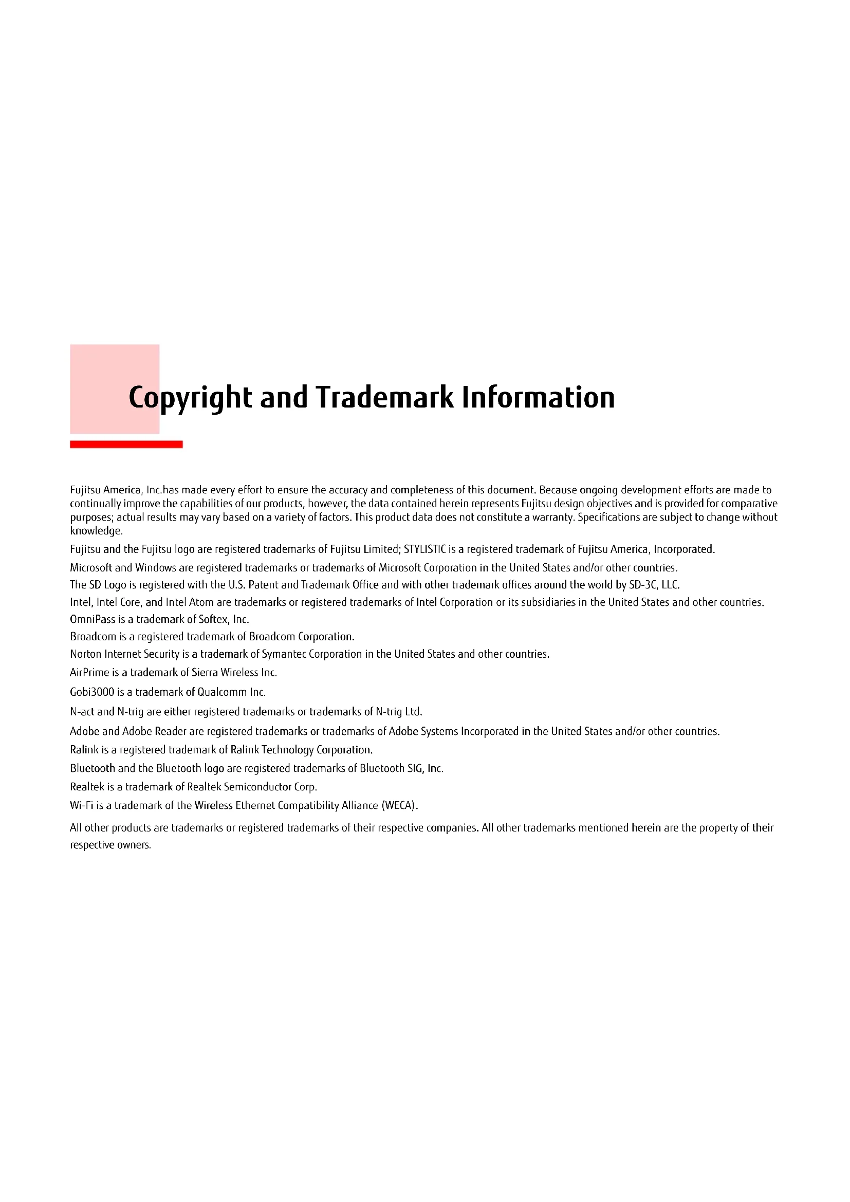 Q552 Tablet PCCopyright and Trademark Information Fujitsu America, Inc.has made every effort to ensure the accuracy and completeness of this document. Because ongoing development efforts are made to continually improve the capabilities of our products, however, the data contained herein represents Fujitsu design objectives and is provided for comparative purposes; actual results may vary based on a variety of factors. This product data does not constitute a warranty. Specifications are subject to change without knowledge. Fujitsu and the Fujitsu logo are registered trademarks of Fujitsu Limited; STYLISTIC is a registered trademark of Fujitsu America, Incorporated. Microsoft and Windows are registered trademarks or trademarks of Microsoft Corporation in the United States and/or other countries. The SD Logo is registered with the U.S. Patent and Trademark Office and with other trademark offices around the world by SD-3C, LLC. Intel, Intel Core, and Intel Atom are trademarks or registered trademarks of Intel Corporation or its subsidiaries in the United States and other countries. OmniPass is a trademark of Softex, Inc. Broadcom is a registered trademark of Broadcom Corporation. Norton Internet Security is a trademark of Symantec Corporation in the United States and other countries. AirPrime is a trademark of Sierra Wireless Inc. Gobi3000 is a trademark of Qualcomm Inc. N-act and N-trig are either registered trademarks or trademarks of N-trig Ltd. Adobe and Adobe Reader are registered trademarks or trademarks of Adobe Systems Incorporated in the United States and/or other countries. Ralink is a registered trademark of Ralink Technology Corporation. Bluetooth and the Bluetooth logo are registered trademarks of Bluetooth SIG, Inc. Realtek is a trademark of Realtek Semiconductor Corp. Wi-Fi is a trademark of the Wireless Ethernet Compatibility Alliance (WECA). All other products are trademarks or registered trademarks of their respective companies. All other trademarks mentioned herein are the property of their respective owners.Copyright 2012 Fujitsu America, Incorporated. All rights reserved. No part of this publication may be copied, reproduced, or translated, without the prior written consent of Fujitsu America, Incorporated. No part of this publication may be stored or transmitted in any electronic form without the prior consent of Fujitsu America, Incorporated. B6FJ-8821-01ENZ0-00