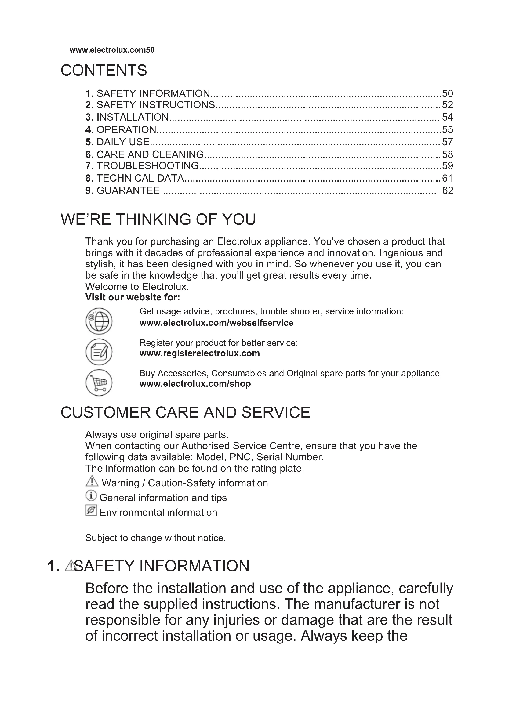 Always use original spare parts. When contacting our Authorised Service Centre, ensure that you have the following data available: Model, PNC, Serial Number. The information can be found on the rating plate. Warning / Caution-Safety information General information and tips Environmental information Subject to change without notice.