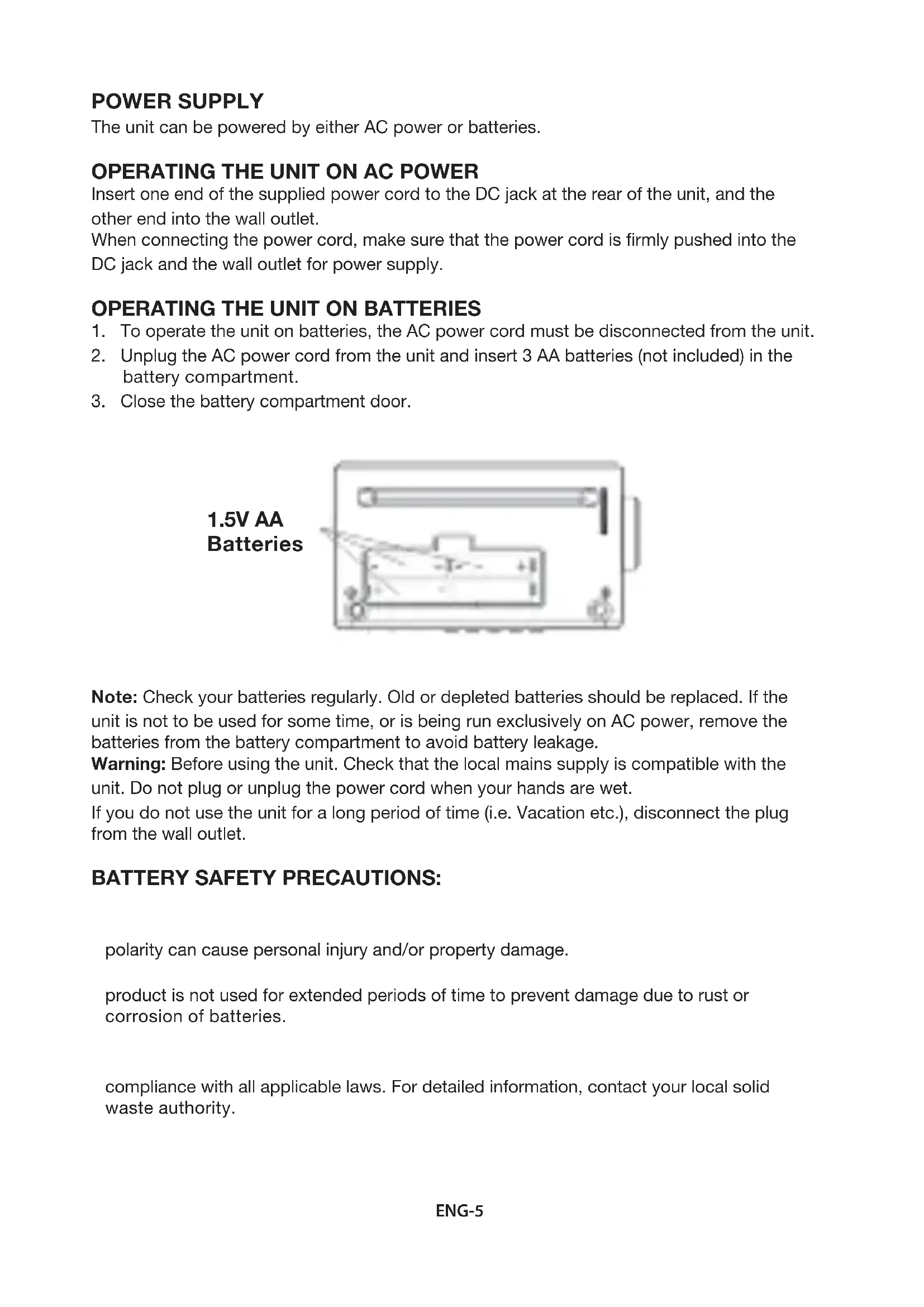 Note: Check your batteries regularly. Old or depleted batteries should be replaced. If the unit is not to be used for some time, or is being run exclusively on AC power, remove the batteries from the battery compartment to avoid battery leakage.