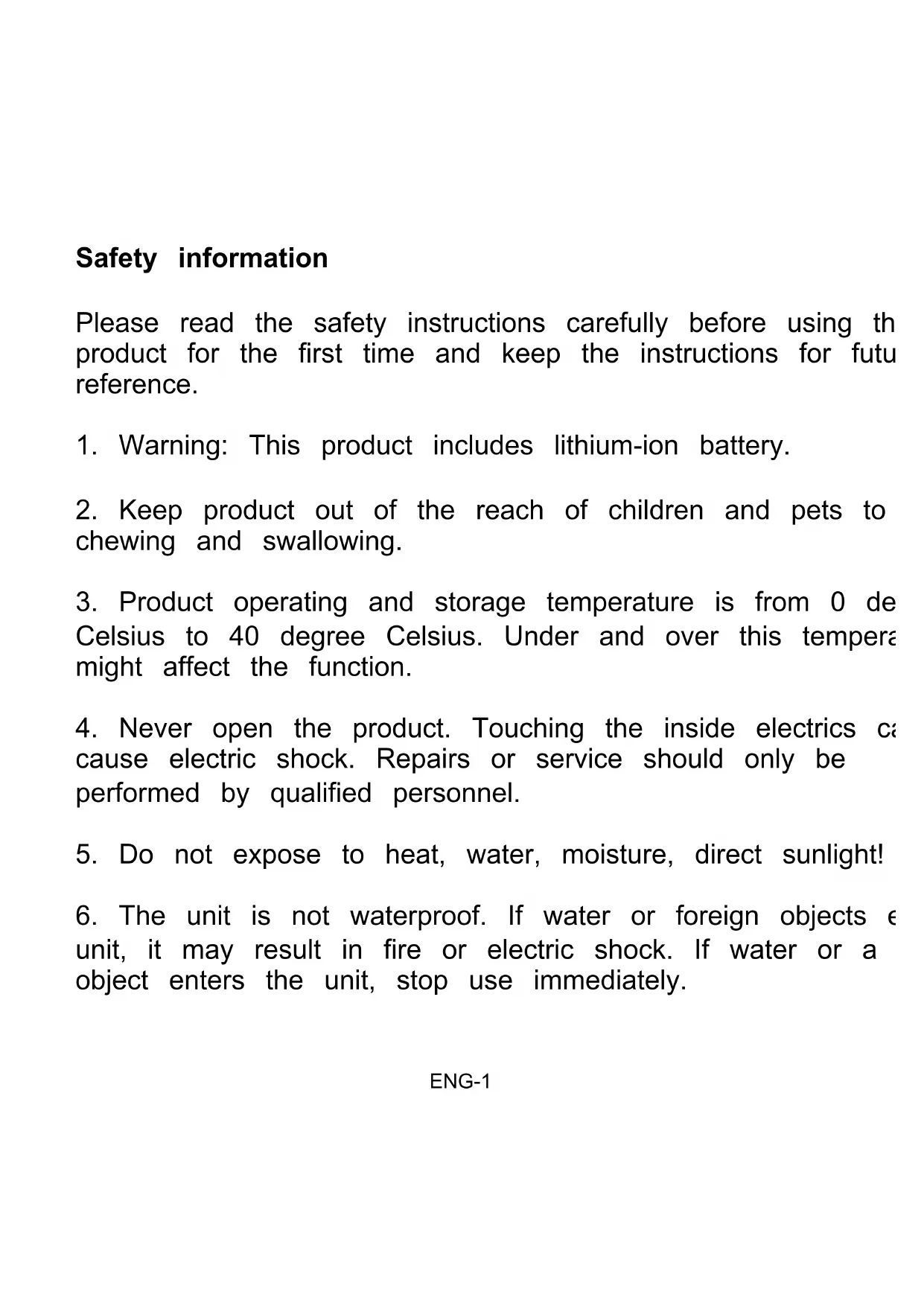 1. Warning: This product includes lithium-ion battery.