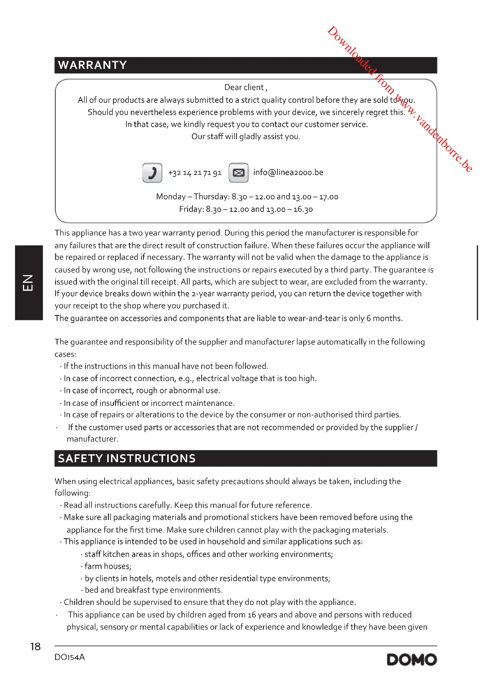 - Remove the water from the reservoir before storing the appliance. ENVIRONMENTAL GUIDELINES This symbol on the product or on its packaging indicates that this product may not be treated as household waste. Instead it must be brought to the applicable collection point for recycling of electrical and electronic equipment. By ensuring this product is disposed of correctly, you will help prevent potential negative consequences for the environment and human health, which could otherwise be caused by inappropriate waste handling of this product. For more detailed information about recycling of this product, please contact your local city oce, your household waste disposal service or the shop where you purchased the product. The packaging is recyclable. Please treat the packaging ecologically. Downloaded from www.vandenborre.be23 DO154A www.domo-elektro.be