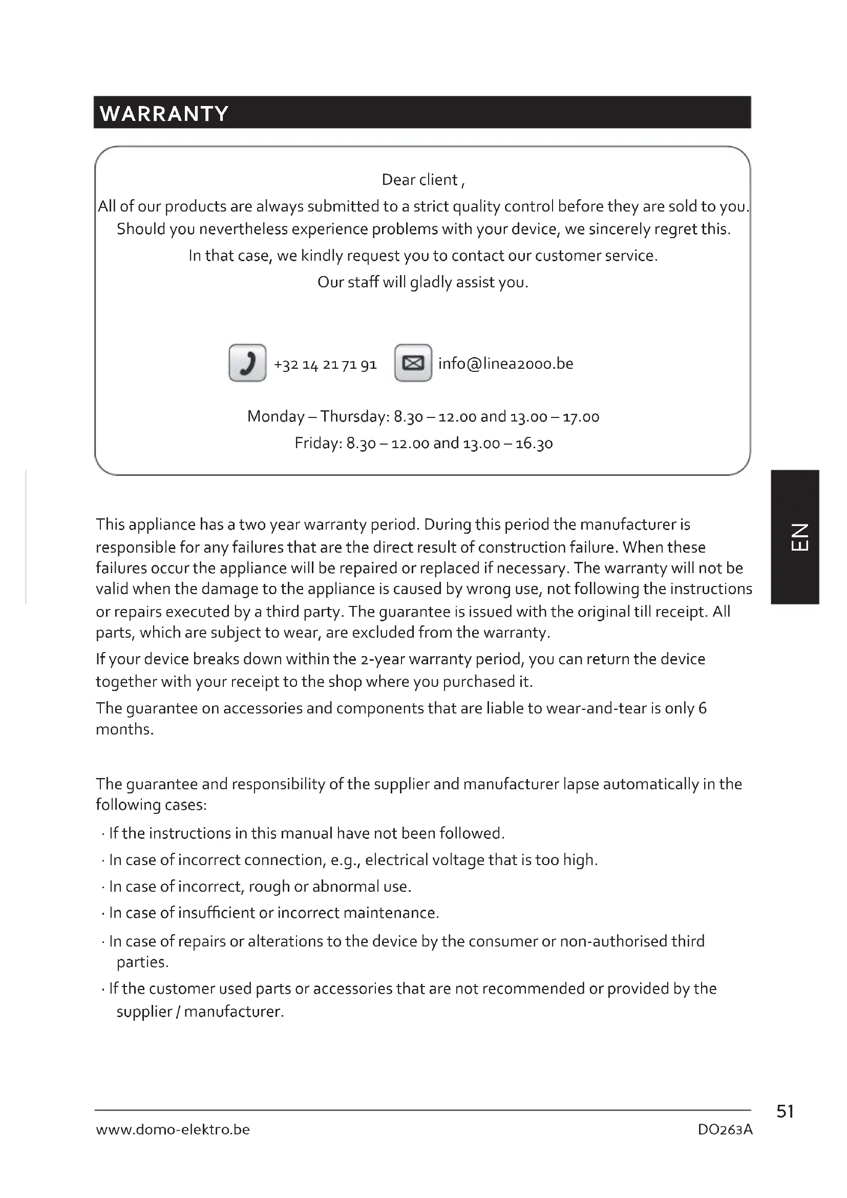 WARRANTY Dear client , All of our products are always submitted to a strict quality control before they are sold to you. Should you nevertheless experience problems with your device, we sincerely regret this. In that case, we kindly request you to contact our customer service. Our sta will gladly assist you. +32 14 21 71 91 info@linea2000.be Monday – Thursday: 8.30 – 12.00 and 13.00 – 17.00 Friday: 8.30 – 12.00 and 13.00 – 16.30 This appliance has a two year warranty period. During this period the manufacturer is responsible for any failures that are the direct result of construction failure. When these failures occur the appliance will be repaired or replaced if necessary. The warranty will not be valid when the damage to the appliance is caused by wrong use, not following the instructions or repairs executed by a third party. The guarantee is issued with the original till receipt. All parts, which are subject to wear, are excluded from the warranty. If your device breaks down within the 2-year warranty period, you can return the device together with your receipt to the shop where you purchased it. The guarantee on accessories and components that are liable to wear-and-tear is only 6 months. The guarantee and responsibility of the supplier and manufacturer lapse automatically in the following cases: