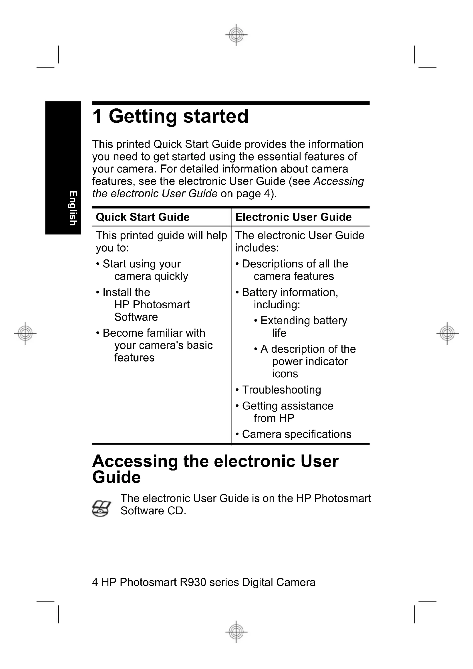 - Camera specifications Accessing the electronic User Guide The electronic User Guide is on the HP Photosmart Software CD. 4 HP Photosmart R930 series Digital Camera EnglishTo view the User Guide: