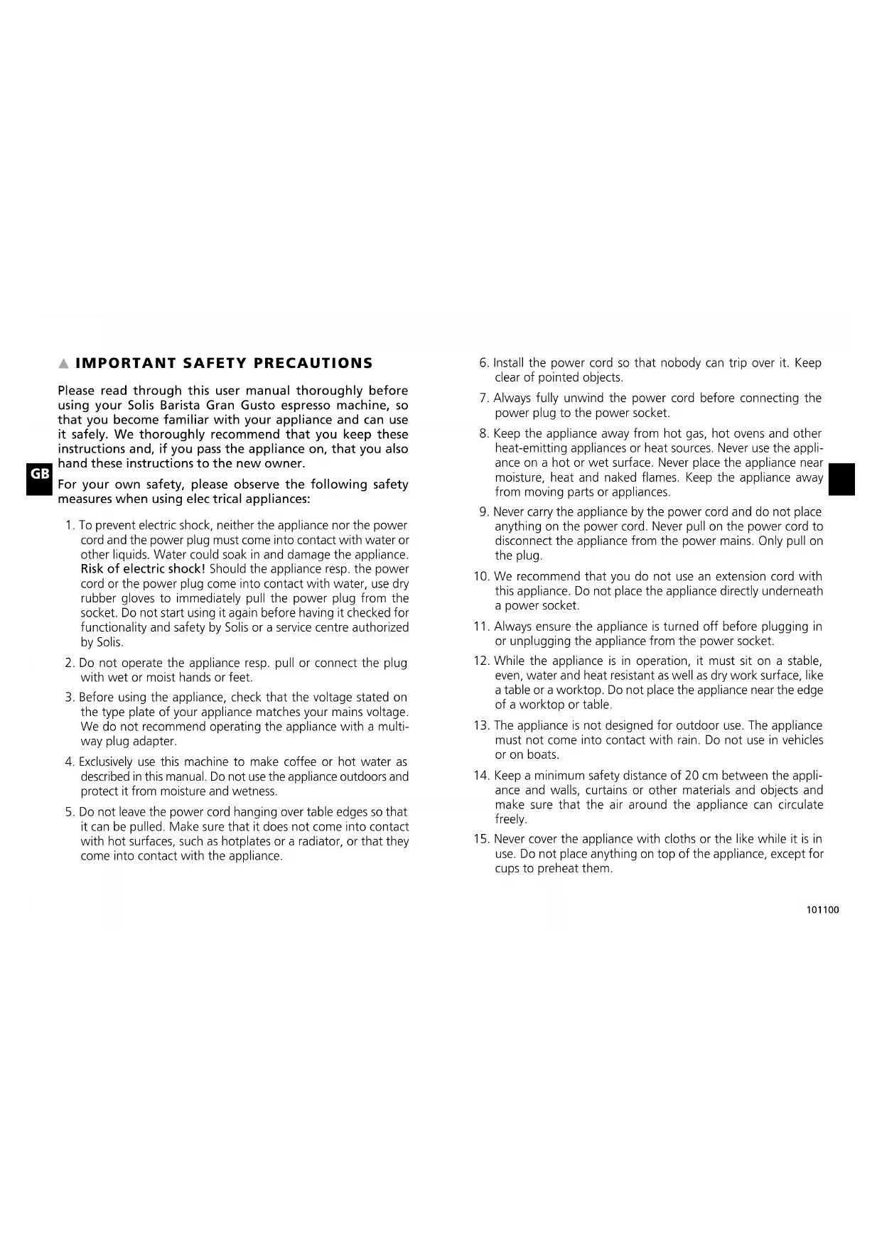 Please read through this user manual thoroughly before using your Solis Barista Gran Gusto espresso machine, so that you become familiar with your appliance and can use it safely. We thoroughly recommend that you keep these instructions and, if you pass the appliance on, that you also hand these instructions to the new owner. For your own safety, please observe the following safety measures when using elec trical appliances: