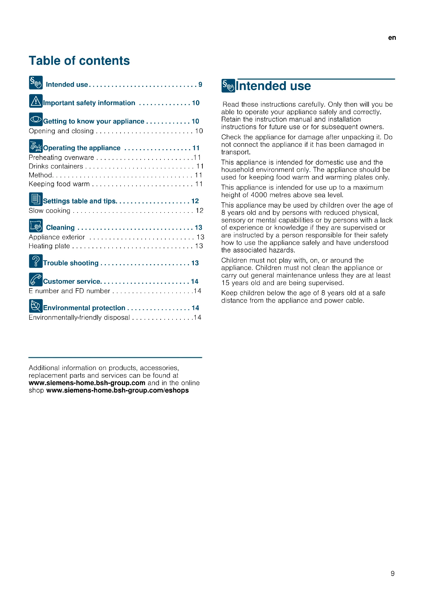 - Getting to know your appliance . . . . . . . . . . . . 10 Opening and closing . . . . . . . . . . . . . . . . . . . . . . . . . 10 1 Operating the appliance . . . . . . . . . . . . . . . . . . 11 Preheating ovenware . . . . . . . . . . . . . . . . . . . . . . . . .11 Drinks containers . . . . . . . . . . . . . . . . . . . . . . . . . . . . 11 Method. . . . . . . . . . . . . . . . . . . . . . . . . . . . . . . . . . . . 11 Keeping food warm . . . . . . . . . . . . . . . . . . . . . . . . . . 11 J Settings table and tips. . . . . . . . . . . . . . . . . . . . 12 Slow cooking . . . . . . . . . . . . . . . . . . . . . . . . . . . . . . . 12 D Cleaning . . . . . . . . . . . . . . . . . . . . . . . . . . . . . . . 13 Appliance exterior . . . . . . . . . . . . . . . . . . . . . . . . . . . 13 Heating plate . . . . . . . . . . . . . . . . . . . . . . . . . . . . . . . 13 3 Trouble shooting . . . . . . . . . . . . . . . . . . . . . . . . 13 4 Customer service. . . . . . . . . . . . . . . . . . . . . . . . 14 E number and FD number . . . . . . . . . . . . . . . . . . . . .14 7 Environmental protection . . . . . . . . . . . . . . . . . 14 Environmentally-friendly disposal . . . . . . . . . . . . . . . .14 Produktinfo Additional information on products, accessories, replacement parts and services can be found at www.siemens-home.bsh-group.com and in the online shop www.siemens-home.bsh-group.com/eshops 8Intended use Intended use Read these instructions carefully. Only then will you be able to operate your appliance safely and correctly. Retain the instruction manual and installation instructions for future use or for subsequent owners. Check the appliance for damage after unpacking it. Do not connect the appliance if it has been damaged in transport. This appliance is intended for domestic use and the household environment only. The appliance should be used for keeping food warm and warming plates only. This appliance is intended for use up to a maximum height of 4000 metres above sea level. This appliance may be used by children over the age of 8 years old and by persons with reduced physical, sensory or mental capabilities or by persons with a lack of experience or knowledge if they are supervised or are instructed by a person responsible for their safety how to use the appliance safely and have understood the associated hazards. Children must not play with, on, or around the appliance. Children must not clean the appliance or carry out general maintenance unless they are at least 15 years old and are being supervised. Keep children below the age of 8 years old at a safe distance from the appliance and power cable.en Important safety information