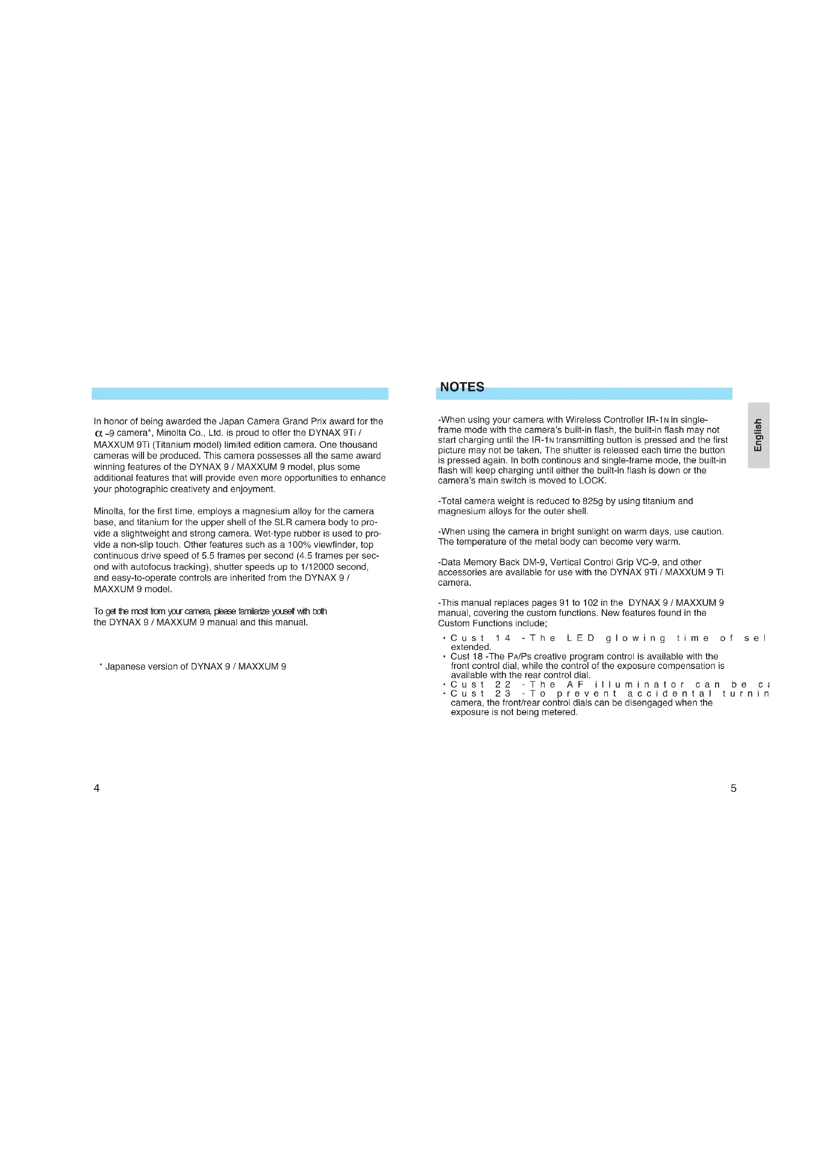 NOTES -When using your camera with Wireless Controller IR-1N in single- frame mode with the camera’s built-in flash, the built-in flash may not start charging until the IR-1N transmitting button is pressed and the first picture may not be taken. The shutter is released each time the button is pressed again. In both continous and single-frame mode, the built-in flash will keep charging until either the built-in flash is down or the camera’s main switch is moved to LOCK. -Total camera weight is reduced to 825g by using titanium and magnesium alloys for the outer shell. -When using the camera in bright sunlight on warm days, use caution. The temperature of the metal body can become very warm. -Data Memory Back DM-9, Vertical Control Grip VC-9, and other accessories are available for use with the DYNAX 9Ti / MAXXUM 9 Ti camera. -This manual replaces pages 91 to 102 in the DYNAX 9 / MAXXUM 9 manual, covering the custom functions. New features found in the Custom Functions include;