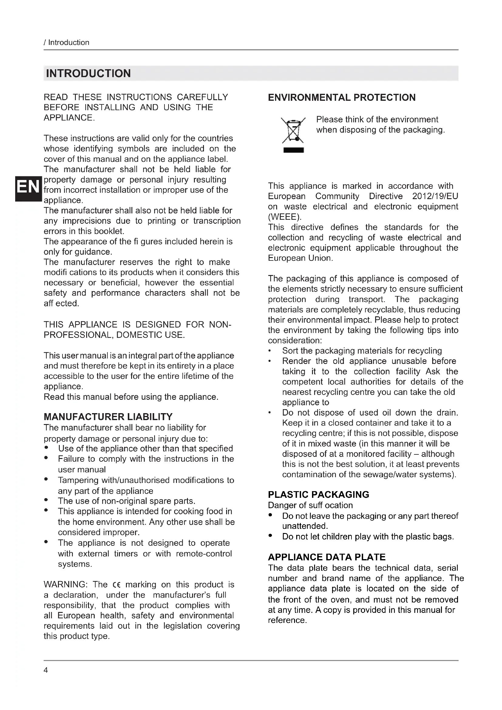 The data plate bears the technical data, serial number and brand name of the appliance. The appliance data plate is located on the side of the front of the oven, and must not be removed at any time. A copy is provided in this manual for reference. Please think of the environment when disposing of the packaging.5