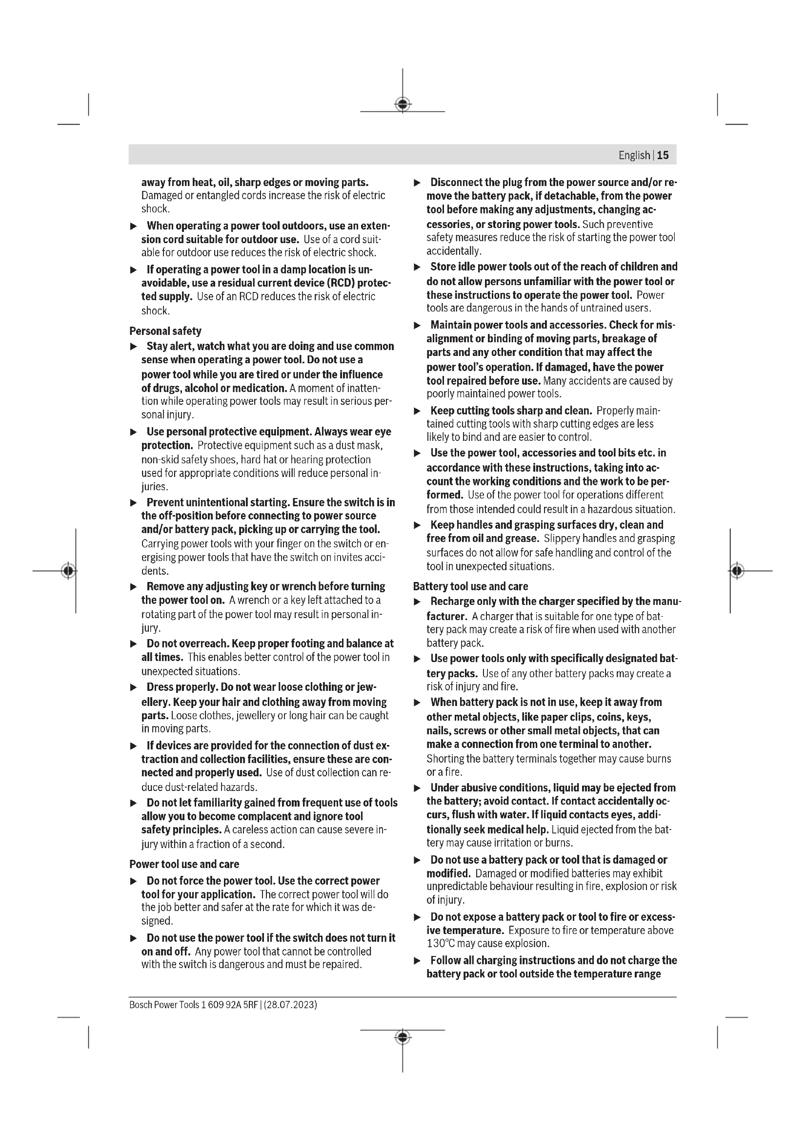 äußeren Abmessung größer als 25cm sind, im Einzel- handelsgeschäft oder in unmittelbarer Nähe hierzu un- entgeltlich zurückzunehmen; die Rücknahme darf nicht an den Kauf eines Elektro- oder Elektronikgerätes ge- knüpft werden und ist auf drei Altgeräte pro Geräteart beschränkt. Der Vertreiber hat beim Abschluss des Kaufvertrags für das neue Elektro- oder Elektronikgerät den Endnutzer über die Möglichkeit zur unentgeltlichen Rückgabe bzw. Abholung des Altgeräts zu informieren und den Endnutzer nach seiner Absicht zu befragen, ob bei der Auslieferung des neuen Ge- räts ein Altgerät zurückgegeben wird. Dies gilt auch bei Vertrieb unter Verwendung von Fernkom- munikationsmitteln, wenn die Lager- und Versandflächen für Elektro- und Elektronikgeräte mindestens 400m² betragen oder die gesamten Lager- und Versandflächen mindestens 800m² betragen, wobei die unentgeltliche Abholung auf Elektro- und Elektronikgeräte der Kategorien 1 (Wärmeüber- träger), 2 (Bildschirmgeräte) und 4 (Großgeräte mit mindes- tens einer äußeren Abmessung über 50cm) beschränkt ist. Für alle übrigen Elektro- und Elektronikgeräte muss der Ver- treiber geeignete Rückgabemöglichkeiten in zumutbarer Ent- fernung zum jeweiligen Endnutzer gewährleisten; das gilt auch für Altgeräte, die in keiner äußeren Abmessung größer als 25cm sind, die der Endnutzer zurückgeben will, ohne ein neues Gerät zu kaufen. Akkus/Batterien: Li-Ion: Bitte beachten Sie die Hinweise im Abschnitt Transport (sie- he „Transport“, Seite13). English Safety Instructions General Power Tool Safety Warnings WARNING Read all safety warnings, instruc- tions, illustrations and specifica- tions provided with this power tool. Failure to follow all in- structions listed below may result in electric shock, fire and/ or serious injury. Save all warnings and instructions for future reference. The term "power tool" in the warnings refers to your mains- operated (corded) power tool or battery-operated (cord- less) power tool. Work area safety u Keep work area clean and well lit. Cluttered or dark areas invite accidents. u Do not operate power tools in explosive atmospheres, such as in the presence of flammable liquids, gases or dust. Power tools create sparks which may ignite the dust or fumes. u Keep children and bystanders away while operating a power tool. Distractions can cause you to lose control. Electrical safety u Power tool plugs must match the outlet. Never modify the plug in any way. Do not use any adapter plugs with earthed (grounded) power tools. Unmodified plugs and matching outlets will reduce risk of electric shock. u Avoid body contact with earthed or grounded sur- faces, such as pipes, radiators, ranges and refrigerat- ors. There is an increased risk of electric shock if your body is earthed or grounded. u Do not expose power tools to rain or wet conditions. Water entering a power tool will increase the risk of elec- tric shock. u Do not abuse the cord. Never use the cord for carry- ing, pulling or unplugging the power tool. Keep cord 1 609 92A 5RF | (28.07.2023) Bosch Power ToolsEnglish | 15 away from heat, oil, sharp edges or moving parts. Damaged or entangled cords increase the risk of electric shock. u When operating a power tool outdoors, use an exten- sion cord suitable for outdoor use. Use of a cord suit- able for outdoor use reduces the risk of electric shock. u If operating a power tool in a damp location is un- avoidable, use a residual current device (RCD) protec- ted supply. Use of an RCD reduces the risk of electric shock. Personal safety u Stay alert, watch what you are doing and use common sense when operating a power tool. Do not use a power tool while you are tired or under the influence of drugs, alcohol or medication. A moment of inatten- tion while operating power tools may result in serious per- sonal injury. u Use personal protective equipment. Always wear eye protection. Protective equipment such as a dust mask, non-skid safety shoes, hard hat or hearing protection used for appropriate conditions will reduce personal in- juries. u Prevent unintentional starting. Ensure the switch is in the off-position before connecting to power source and/or battery pack, picking up or carrying the tool. Carrying power tools with your finger on the switch or en- ergising power tools that have the switch on invites acci- dents. u Remove any adjusting key or wrench before turning the power tool on. A wrench or a key left attached to a rotating part of the power tool may result in personal in- jury. u Do not overreach. Keep proper footing and balance at all times. This enables better control of the power tool in unexpected situations. u Dress properly. Do not wear loose clothing or jew- ellery. Keep your hair and clothing away from moving parts. Loose clothes, jewellery or long hair can be caught in moving parts. u If devices are provided for the connection of dust ex- traction and collection facilities, ensure these are con- nected and properly used. Use of dust collection can re- duce dust-related hazards. u Do not let familiarity gained from frequent use of tools allow you to become complacent and ignore tool safety principles. A careless action can cause severe in- jury within a fraction of a second. Power tool use and care u Do not force the power tool. Use the correct power tool for your application. The correct power tool will do the job better and safer at the rate for which it was de- signed. u Do not use the power tool if the switch does not turn it on and off. Any power tool that cannot be controlled with the switch is dangerous and must be repaired. u Disconnect the plug from the power source and/or re- move the battery pack, if detachable, from the power tool before making any adjustments, changing ac- cessories, or storing power tools. Such preventive safety measures reduce the risk of starting the power tool accidentally. u Store idle power tools out of the reach of children and do