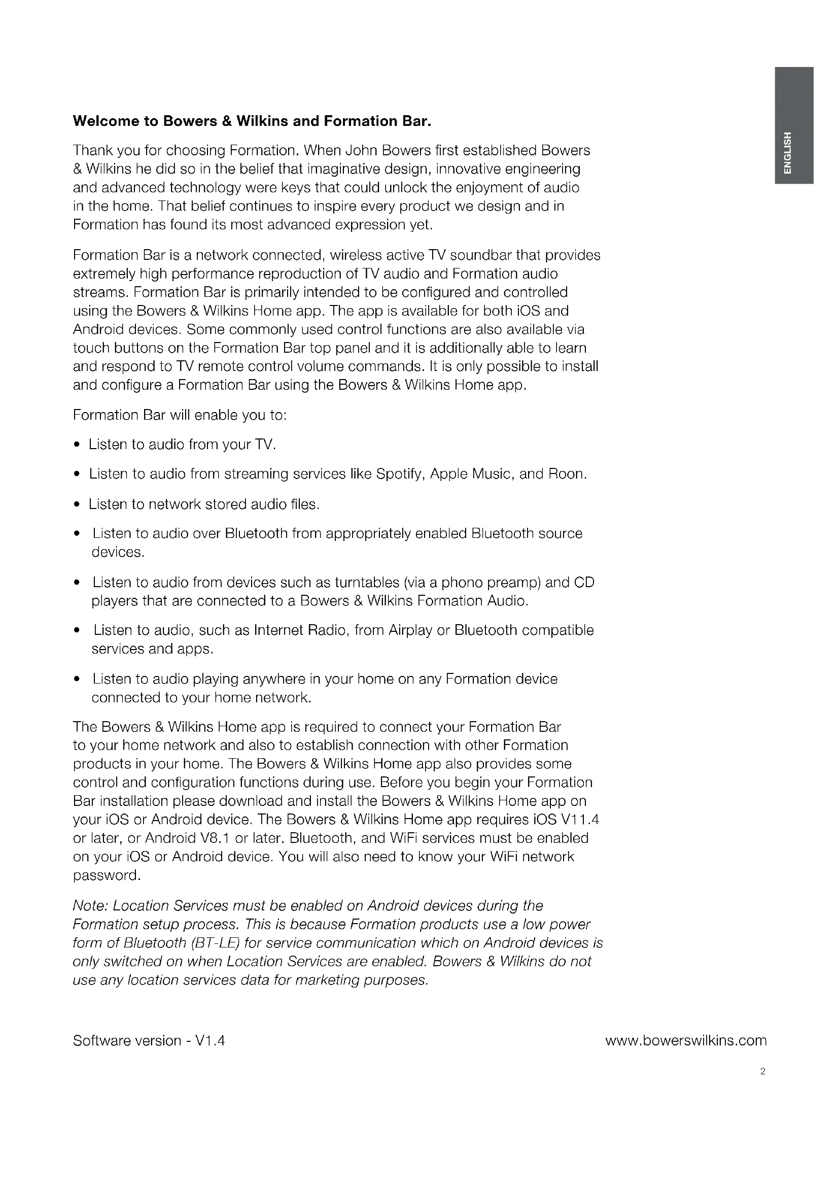 - Listen to audio playing anywhere in your home on any Formation device connected to your home network. The Bowers & Wilkins Home app is required to connect your Formation Bar to your home network and also to establish connection with other Formation products in your home. The Bowers & Wilkins Home app also provides some control and conguration functions during use. Before you begin your Formation Bar installation please download and install the Bowers & Wilkins Home app on your iOS or Android device. The Bowers & Wilkins Home app requires iOS V11.4 or later, or Android V8.1 or later. Bluetooth, and WiFi services must be enabled on your iOS or Android device. You will also need to know your WiFi network password. Note: Location Services must be enabled on Android devices during the Formation setup process. This is because Formation products use a low power form of Bluetooth (BT-LE) for service communication which on Android devices is only switched on when Location Services are enabled. Bowers & Wilkins do not use any location services data for marketing purposes. Software version - V1.4 ENGLISH Contents ENGLISH 2