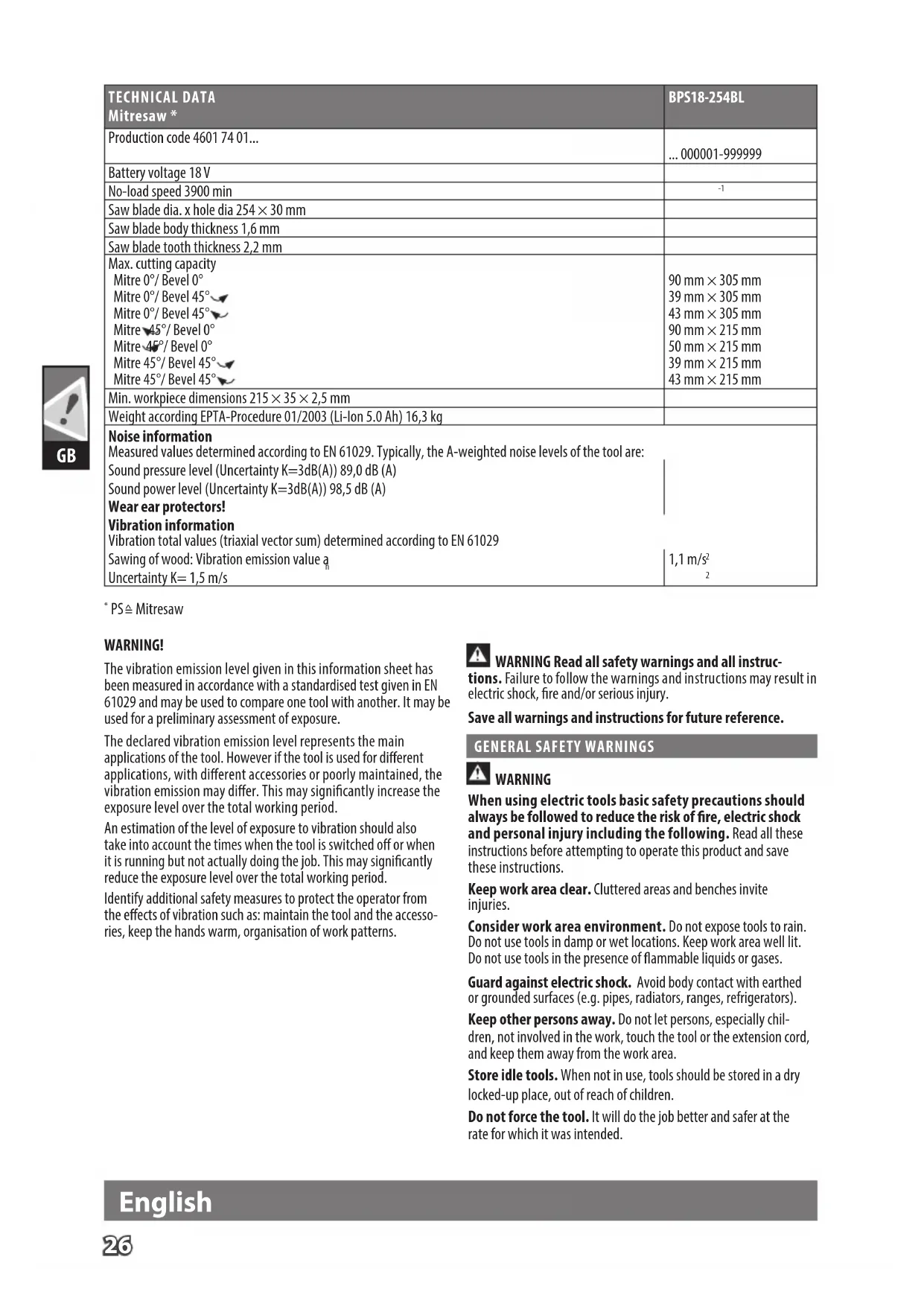 Mitresaw WARNING! The vibration emission level given in this information sheet has been measured in accordance with a standardised test given in EN 61029 and may be used to compare one tool with another. It may be used for a preliminary assessment of exposure. The declared vibration emission level represents the main applications of the tool. However if the tool is used for dierent applications, with dierent accessories or poorly maintained, the vibration emission may dier. This may signicantly increase the exposure level over the total working period. An estimation of the level of exposure to vibration should also take into account the times when the tool is switched o or when it is running but not actually doing the job. This may signicantly reduce the exposure level over the total working period. Identify additional safety measures to protect the operator from the eects of vibration such as: maintain the tool and the accesso- ries, keep the hands warm, organisation of work patterns. WARNING Read all safety warnings and all instruc- tions. Failure to follow the warnings and instructions may result in electric shock, re and/or serious injury. Save all warnings and instructions for future reference.