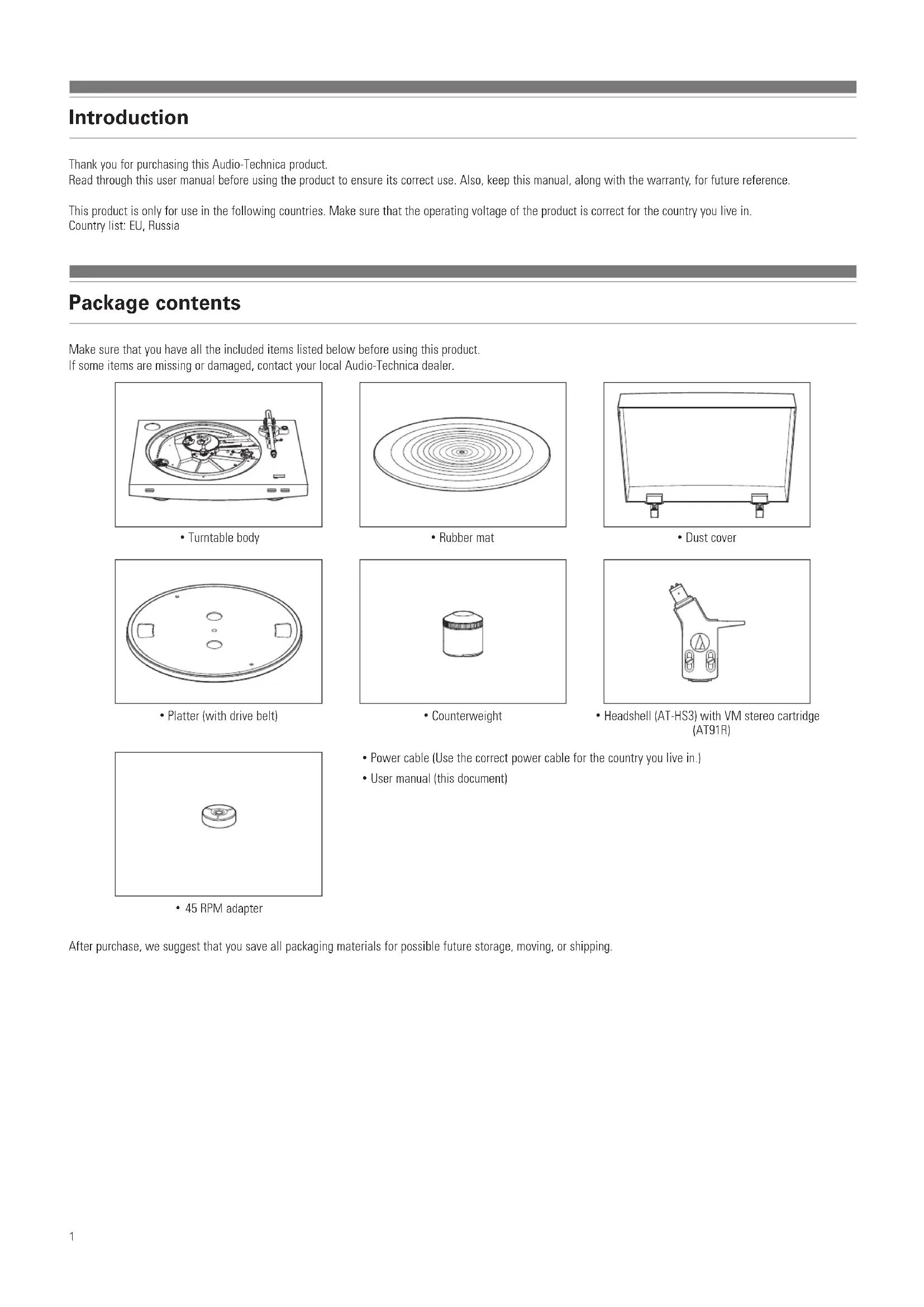 Руководство пользователя Полностью автоматический проигрыватель виниловых пластинок с ре менным приводом RU1 Introduction Thank you for purchasing this Audio-Technica product. Read through this user manual before using the product to ensure its correct use. Also, keep this manual, along with the warranty, for future reference. This product is only for use in the following countries. Make sure that the operating voltage of the product is correct for the country you live in. Country list: EU, Russia Package contents Make sure that you have all the included items listed below before using this product. If some items are missing or damaged, contact your local Audio-Technica dealer.