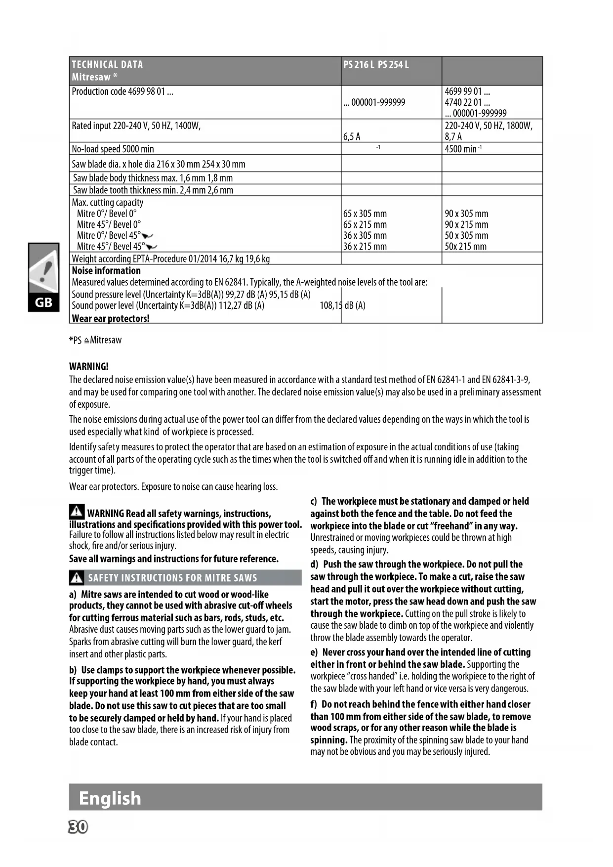 Mitresaw WARNING! The declared noise emission value(s) have been measured in accordance with a standard test method of EN 62841-1 and EN 62841-3-9, and may be used for comparing one tool with another. The declared noise emission value(s) may also be used in a preliminary assessment of exposure. The noise emissions during actual use of the power tool can dier from the declared values depending on the ways in which the tool is used especially what kind of workpiece is processed. Identify safety measures to protect the operator that are based on an estimation of exposure in the actual conditions of use (taking account of all parts of the operating cycle such as the times when the tool is switched o and when it is running idle in addition to the trigger time). Wear ear protectors. Exposure to noise can cause hearing loss. WARNING Read all safety warnings, instructions, illustrations and specications provided with this power tool. Failure to follow all instructions listed below may result in electric shock, re and/or serious injury. Save all warnings and instructions for future reference.