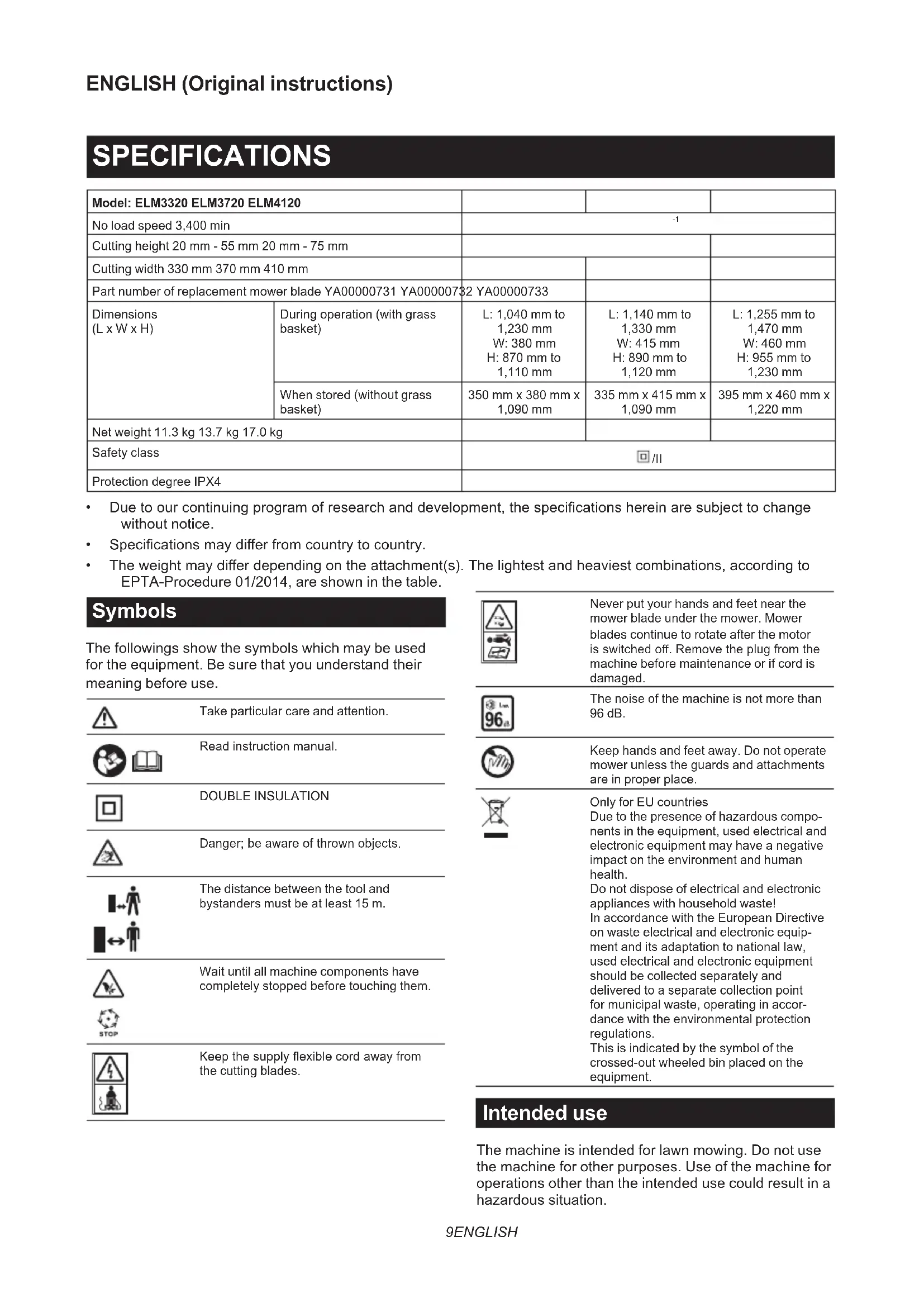 - Theweightmaydierdependingontheattachment(s).Thelightestandheaviestcombinations,accordingto EPTA-Procedure 01/2014, are shown in the table. Symbols The followings show the symbols which may be used for the equipment. Be sure that you understand their meaning before use. Take particular care and attention. Read instruction manual. DOUBLE INSULATION Danger;beawareofthrownobjects. The distance between the tool and bystanders must be at least 15 m. Wait until all machine components have completely stopped before touching them. Keepthesupplyexiblecordawayfrom the cutting blades. Never put your hands and feet near the mower blade under the mower. Mower blades continue to rotate after the motor isswitchedo.Removetheplugfromthe machine before maintenance or if cord is damaged. The noise of the machine is not more than 96 dB. Keep hands and feet away. Do not operate mower unless the guards and attachments are in proper place. Only for EU countries Due to the presence of hazardous compo- nents in the equipment, used electrical and electronic equipment may have a negative impact on the environment and human health. Do not dispose of electrical and electronic appliances with household waste! In accordance with the European Directive on waste electrical and electronic equip- ment and its adaptation to national law, used electrical and electronic equipment should be collected separately and delivered to a separate collection point for municipal waste, operating in accor- dance with the environmental protection regulations. This is indicated by the symbol of the crossed-out wheeled bin placed on the equipment. Intended use The machine is intended for lawn mowing. Do not use the machine for other purposes. Use of the machine for operations other than the intended use could result in a hazardous situation.10 ENGLISH Power supply The tool should be connected only to a power supply of the same voltage as indicated on the nameplate, and can only be operated on single-phase AC supply. They are double-insulated and can, therefore, also be used from sockets without earth wire. If the supply cord is damaged, it must be replaced by the manufacturer or its service agent in order to avoid a hazard. For public low-voltage distribution systems of between 220 V and 250 V Switching operations of electric apparatus cause voltageuctuations.Theoperationofthisdevice under unfavorable mains conditions can have adverse eectstotheoperationofotherequipment.Witha mains impedance equal or less than 0.425 Ohms (for ELM3720) or 0.427 Ohms (for ELM4120), it can be pre- sumedthattherewillbenonegativeeects.Themains socket used for this device must be protected with a fuse or protective circuit breaker having slow tripping characteristics. Noise Applicable standard : EN IEC 62841-4-3 Model Sound pressure level Sound power level