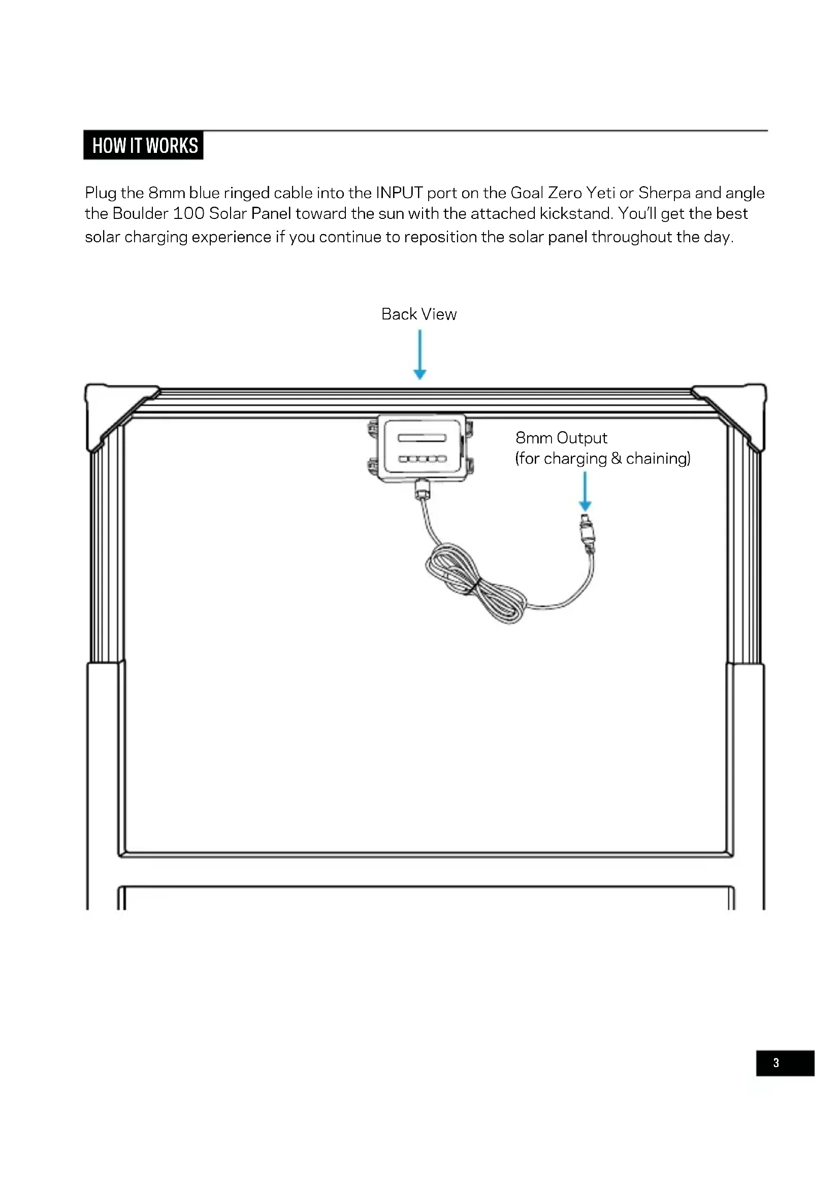 Plug the 8mm blue ringed cable into the INPUT port on the Goal Zero Yeti or Sherpa and angle the Boulder 100 Solar Panel toward the sun with the attached kickstand. You’ll get the best solar charging experience if you continue to reposition the solar panel throughout the day. 8mm Output (for charging & chaining) Back View4 To chain Boulder 100 Solar Panels together, and for Boulder configurations over 150W, you’ll need to purchase a combiner cable from Goal Zero. Give our customer solutions center a call for help picking the right cable for your setup.
