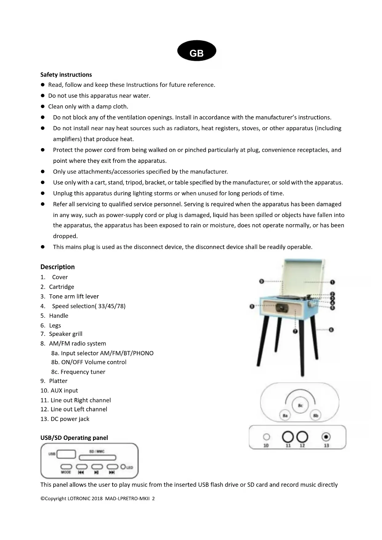 USB/SD Operating panel This panel allows the user to play music from the inserted USB flash drive or SD card and record music directly GB©Copyright LOTRONIC 2018 MAD-LPRETRO-MKII 3 from the vinyl or AUX input. : play previous track : Play next track MODE: Short press to cycle between USB/SD & BT : Short press to play or pause. Long press to delete the current music. In REC mode, press to stop recording. BT control: When the tone arm is in rest position, the Bluetooth function is selected automatically until you press the MODE button to change between USB/SD and BT. Remarks