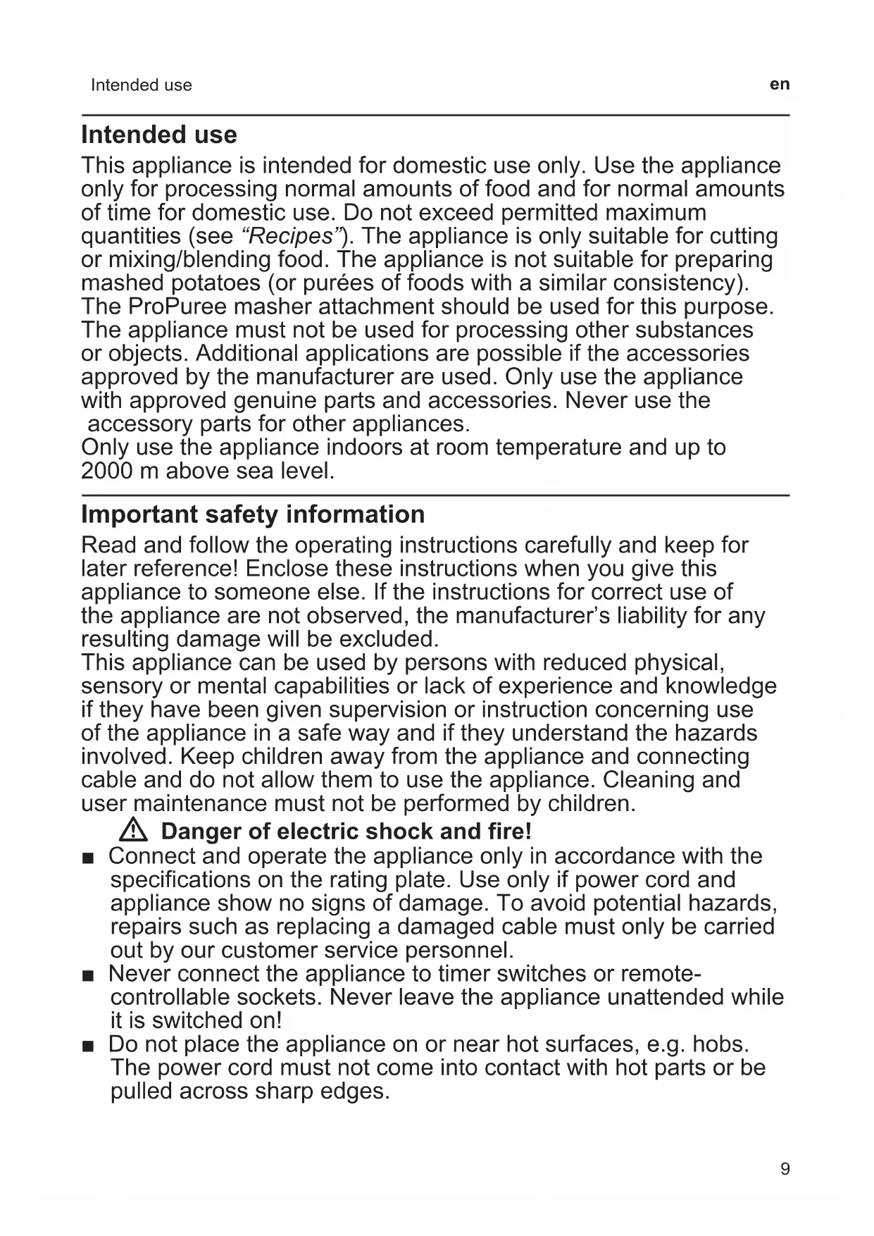 Intended use Intended use This appliance is intended for domestic use only. Use the appliance only for processing normal amounts of food and for normal amounts of time for domestic use. Do not exceed permitted maximum quantities (see “Recipes”). The appliance is only suitable for cutting or mixing/blending food. The appliance is not suitable for preparing mashed potatoes (or purées of foods with a similar consistency). The ProPuree masher attachment should be used for this purpose. The appliance must not be used for processing other substances or objects. Additional applications are possible if the accessories approved by the manufacturer are used. Only use the appliance with approved genuine parts and accessories. Never use the accessory parts for other appliances. Only use the appliance indoors at room temperature and up to 2000 m above sea level. Important safety information Read and follow the operating instructions carefully and keep for later reference! Enclose these instructions when you give this appliance to someone else. If the instructions for correct use of the appliance are not observed, the manufacturer’s liability for any resulting damage will be excluded. This appliance can be used by persons with reduced physical, sensory or mental capabilities or lack of experience and knowledge if they have been given supervision or instruction concerning use of the appliance in a safe way and if they understand the hazards involved. Keep children away from the appliance and connecting cable and do not allow them to use the appliance. Cleaning and user maintenance must not be performed by children. W Danger of electric shock and fire! ■ Connect and operate the appliance only in accordance with the specifications on the rating plate. Use only if power cord and appliance show no signs of damage. To avoid potential hazards, repairs such as replacing a damaged cable must only be carried out by our customer service personnel. ■ Never connect the appliance to timer switches or remote- controllable sockets. Never leave the appliance unattended while it is switched on! ■ Do not place the appliance on or near hot surfaces, e.g. hobs. The power cord must not come into contact with hot parts or be pulled across sharp edges.10 en Important safety information ■ Never immerse the base unit in liquids or hold under running water and do not clean in the dishwasher. Do not steam-clean the appliance. Do not use the appliance with damp hands. ■ If your appliance falls in water or some other liquid, then it is not allowed to use the appliance anymore. ■ Only immerse the blender foot into the food as far as the marking Í or there will be a risk of electric shock! ■ After each use, whenever the appliance is unsupervised, prior to assembly, prior to disassembly, prior to cleaning and in the event of an error, the appliance must always be disconnected from the mains. W Risk of injury! ■ Before replacing accessories or additional parts which move during operation, the appliance must be switched off and disconnected from the power supply. ■ After switching off, the drive continues running for a short time. Wait until the drive has come to a standstill. ■ Never grip the blade in the blender foot. Never clean the blade in the blender foot with bare hands. W Risk of scalding! Take care when processing hot food. Hot food may splash during processing. W Risk of suffocation! Do not allow children to play with packaging material. W Attention! ■ We recommend that the appliance is never switched on for longer than is necessary to process the ingredients. Do not operate at no-load. ■ The blender jug is not suitable for use in the microwave. ■ Never place blender foot on hot surfaces or use in very hot food. Leave boiling food to cool down to at least 80°C before processing. Before using the hand blender in a cooking pot, take the pot off the hotplate. W Important! It is essential to clean the appliance thoroughly after each use or after it has not been used for an extended period. X “Cleaning” see page 1211