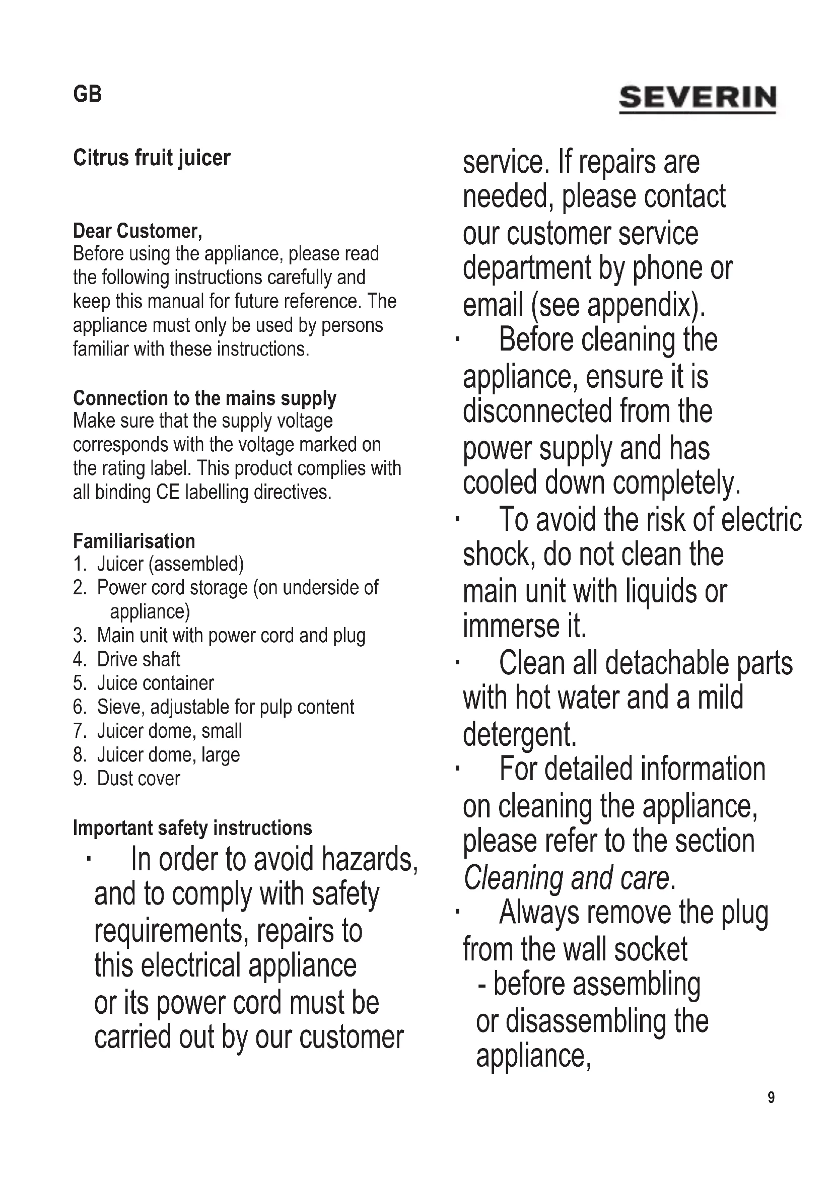 Citrus fruit juicer Dear Customer, Before using the appliance, please read the following instructions carefully and keep this manual for future reference. The appliance must only be used by persons familiar with these instructions. Connection to the mains supply Make sure that the supply voltage corresponds with the voltage marked on the rating label. This product complies with all binding CE labelling directives. Familiarisation
