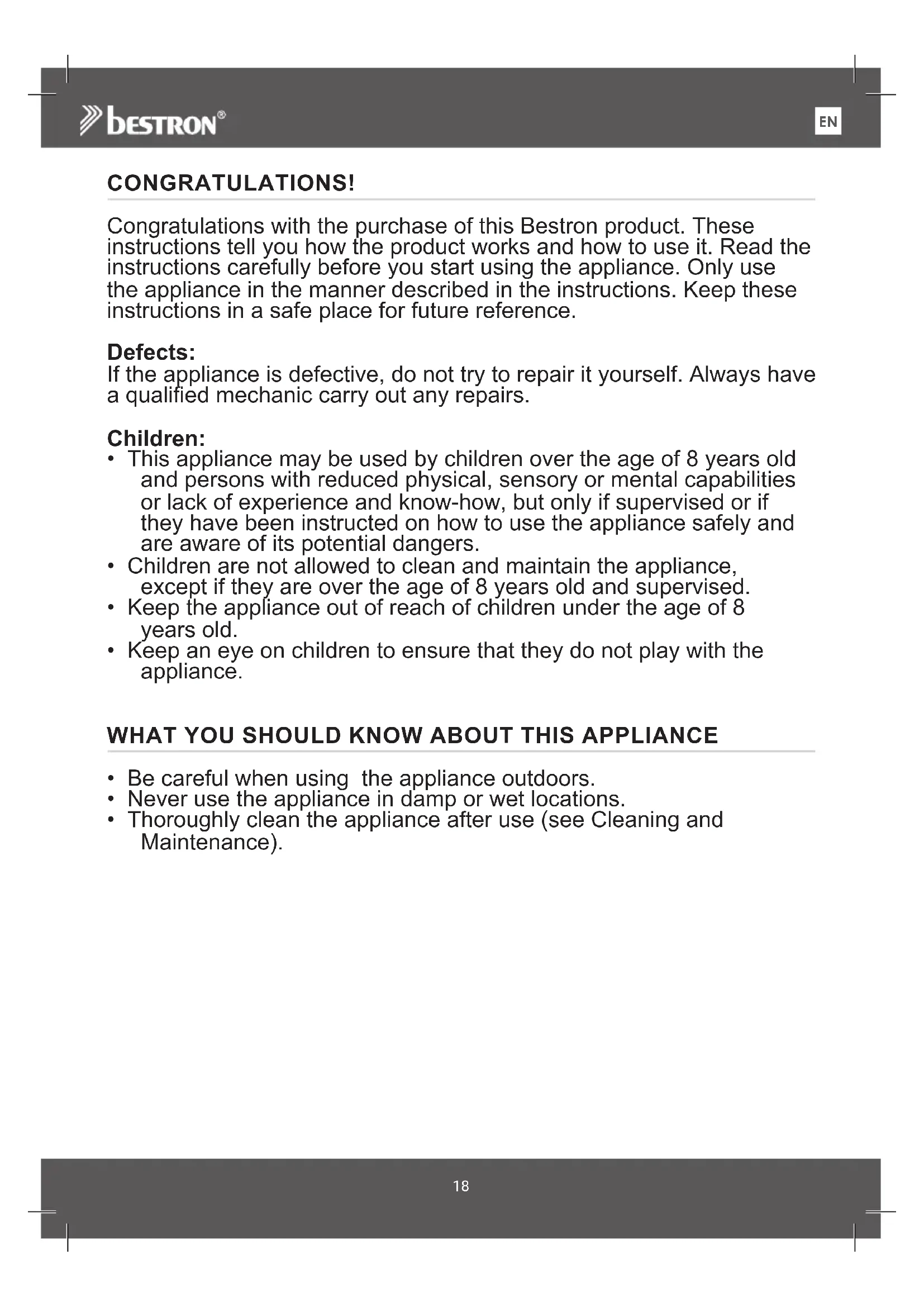 Congratulations with the purchase of this Bestron product. These instructions tell you how the product works and how to use it. Read the instructions carefully before you start using the appliance. Only use the appliance in the manner described in the instructions. Keep these instructions in a safe place for future reference.