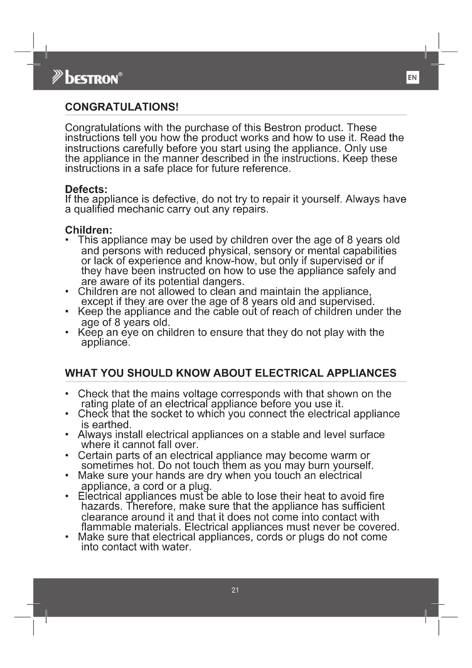 CONGRATULATIONS! Congratulations with the purchase of this Bestron product. These instructions tell you how the product works and how to use it. Read the instructions carefully before you start using the appliance. Only use the appliance in the manner described in the instructions. Keep these instructions in a safe place for future reference. Defects: If the appliance is defective, do not try to repair it yourself. Always have a qualified mechanic carry out any repairs. Children: