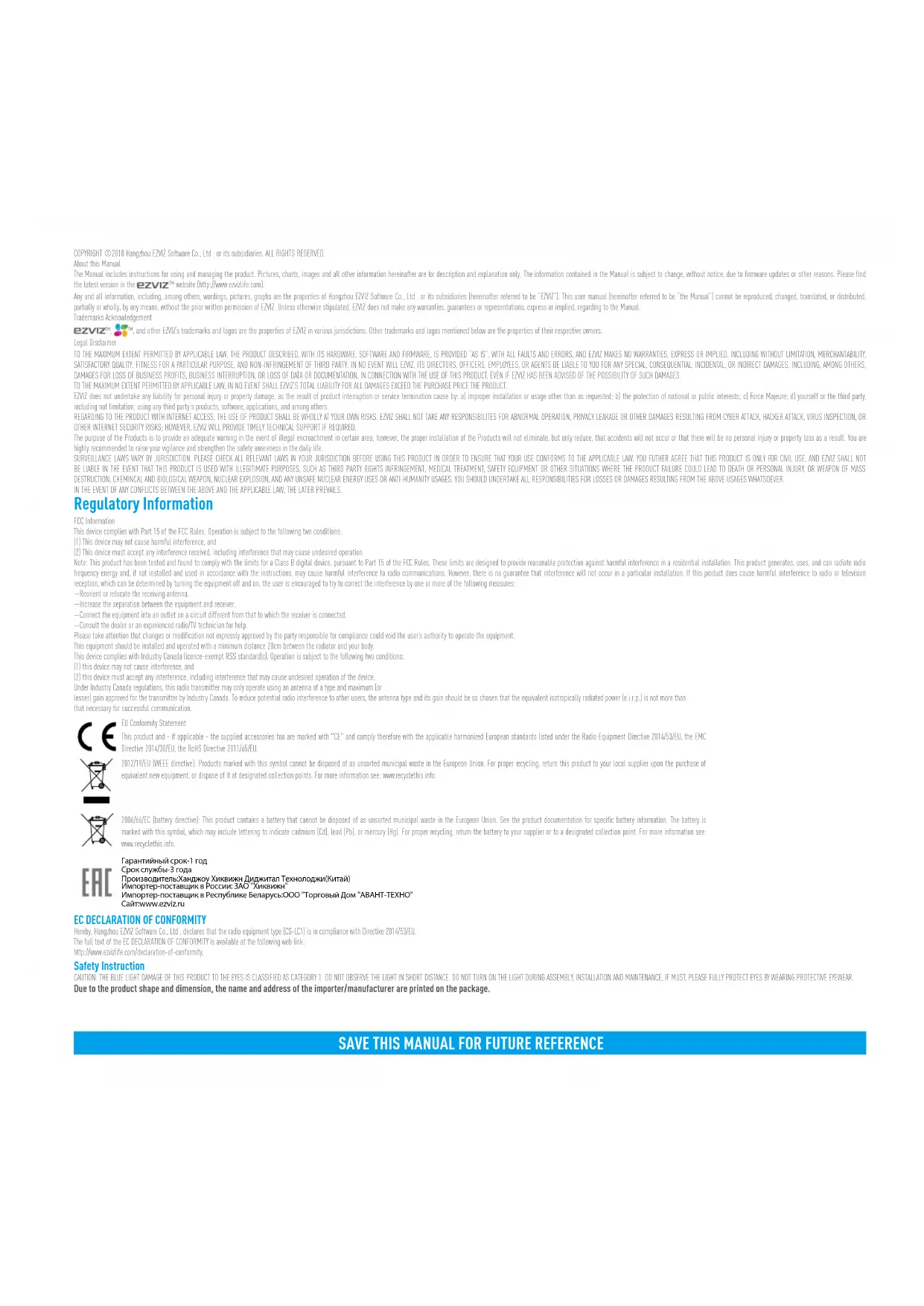 www.ezvizlife.comSAVE THIS MANUAL FOR FUTURE REFERENCE COPYRIGHT ©2018 Hangzhou EZVIZ Software Co., Ltd . or its subsidiaries. ALL RIGHTS RESERVED. About this Manual The Manual includes instructions for using and managing the product. Pictures, charts, images and all other information hereinafter are for description and explanation only. The information contained in the Manual is subject to change, without notice, due to firmware updates or other reasons. Please find the latest version in the ™ website (http://www.ezvizlife.com). Any and all information, including, among others, wordings, pictures, graphs are the properties of Hangzhou EZVIZ Software Co., Ltd . or its subsidiaries (hereinafter referred to be “EZVIZ”). This user manual (hereinafter referred to be “the Manual”) cannot be reproduced, changed, translated, or distributed, partially or wholly, by any means, without the prior written permission of EZVIZ. Unless otherwise stipulated, EZVIZ does not make any warranties, guarantees or representations, express or implied, regarding to the Manual. Trademarks Acknowledgement ™, ™, and other EZVIZ’s trademarks and logos are the properties of EZVIZ in various jurisdictions. Other trademarks and logos mentioned below are the properties of their respective owners. Legal Disclaimer TO THE MAXIMUM EXTENT PERMITTED BY APPLICABLE LAW, THE PRODUCT DESCRIBED, WITH ITS HARDWARE, SOFTWARE AND FIRMWARE, IS PROVIDED “AS IS”, WITH ALL FAULTS AND ERRORS, AND EZVIZ MAKES NO WARRANTIES, EXPRESS OR IMPLIED, INCLUDING WITHOUT LIMITATION, MERCHANTABILITY, SATISFACTORY QUALITY, FITNESS FOR A PARTICULAR PURPOSE, AND NON-INFRINGEMENT OF THIRD PARTY. IN NO EVENT WILL EZVIZ, ITS DIRECTORS, OFFICERS, EMPLOYEES, OR AGENTS BE LIABLE TO YOU FOR ANY SPECIAL, CONSEQUENTIAL, INCIDENTAL, OR INDIRECT DAMAGES, INCLUDING, AMONG OTHERS, DAMAGES FOR LOSS OF BUSINESS PROFITS, BUSINESS INTERRUPTION, OR LOSS OF DATA OR DOCUMENTATION, IN CONNECTION WITH THE USE OF THIS PRODUCT, EVEN IF EZVIZ HAS BEEN ADVISED OF THE POSSIBILITY OF SUCH DAMAGES. TO THE MAXIMUM EXTENT PERMITTED BY APPLICABLE LAW, IN NO EVENT SHALL EZVIZ’S TOTAL LIABILITY FOR ALL DAMAGES EXCEED THE PURCHASE PRICE THE PRODUCT. EZVIZ does not undertake any liability for personal injury or property damage, as the result of product interruption or service termination cause by: a) improper installation or usage other than as requested; b) the protection of national or public interests; c) Force Majeure; d) yourself or the third party, including not limitation, using any third party’s products, software, applications, and among others. REGARDING TO THE PRODUCT WITH INTERNET ACCESS, THE USE OF PRODUCT SHALL BE WHOLLY AT YOUR OWN RISKS. EZVIZ SHALL NOT TAKE ANY RESPONSIBILITES FOR ABNORMAL OPERATION, PRIVACY LEAKAGE OR OTHER DAMAGES RESULTING FROM CYBER ATTACK, HACKER ATTACK, VIRUS INSPECTION, OR OTHER INTERNET SECURITY RISKS; HOWEVER, EZVIZ WILL PROVIDE TIMELY TECHNICAL SUPPORT IF REQUIRED. The purpose of the Products is to provide an adequate warning in the event of illegal encroachment in certain area; however, the proper installation of the Products will not eliminate, but only reduce, that accidents will not occur or that there will be no personal injury or property loss as a result. You are highly recommended to raise your vigilance and strengthen the safety awareness in the daily life. SURVEILLANCE LAWS VARY BY JURISDICTION. PLEASE CHECK ALL RELEVANT LAWS IN YOUR JURISDICTION BEFORE USING THIS PRODUCT IN ORDER TO ENSURE THAT YOUR USE CONFORMS TO THE APPLICABLE LAW. YOU FUTHER AGREE THAT THIS PRODUCT IS ONLY FOR CIVIL USE, AND EZVIZ SHALL NOT BE LIABLE IN THE EVENT THAT THIS PRODUCT IS USED WITH ILLEGITIMATE PURPOSES, SUCH AS THIRD PARTY RIGHTS INFRINGEMENT, MEDICAL TREATMENT, SAFETY EQUIPMENT OR OTHER SITUATIONS WHERE THE PRODUCT FAILURE COULD LEAD TO DEATH OR PERSONAL INJURY, OR WEAPON OF MASS DESTRUCTION, CHEMINCAL AND BIOLOGICAL WEAPON, NUCLEAR EXPLOSION, AND ANY UNSAFE NUCLEAR ENERGY USES OR ANTI-HUMANITY USAGES. YOU SHOULD UNDERTAKE ALL RESPONSIBILITIES FOR LOSSES OR DAMAGES RESULTING FROM THE ABOVE USAGES WHATSOEVER. IN THE EVENT OF ANY CONFLICTS BETWEEN THE ABOVE AND THE APPLICABLE LAW, THE LATER PREVAILS. Regulatory Information FCC Information This device complies with Part 15 of the FCC Rules. Operation is subject to the following two conditions: (1) This device may not cause harmful interference, and (2) This device must accept any interference received, including interference that may cause undesired operation. Note: This product has been tested and found to comply with the limits for a Class B digital device, pursuant to Part 15 of the FCC Rules. These limits are designed to provide reasonable protection against harmful interference in a residential installation. This product generates, uses, and can radiate radio frequency energy and, if not installed and used in accordance with the instructions, may cause harmful interference to radio communications. However, there is no guarantee that interference will not occur in a particular installation. If this product does cause harmful interference to radio or television reception, which can be determined by turning the equipment off and on, the user is encouraged to try to correct the interference by one or more of the following measures: —Reorient or relocate the receiving antenna. —Increase the separation between the equipment and receiver. —Connect the equipment into an outlet on a circuit different from that to which the receiver is connected. —Consult the dealer or an experienced radio/TV technician for help. Please take attention that changes or modification not expressly approved by the party responsible for compliance could void the user’s authority to operate the equipment. This equipment should be installed and operated with a minimum distance 20cm between the radiator and your body. This device complies with Industry Canada licence-exempt RSS standard(s). Operati