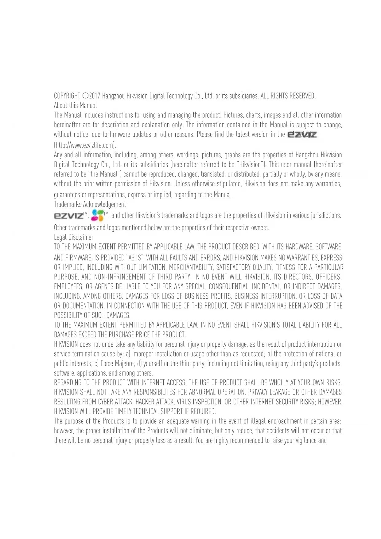 ez360 Series www.ezvizlife.com NLCOPYRIGHT ©2017 Hangzhou Hikvision Digital Technology Co., Ltd. or its subsidiaries. ALL RIGHTS RESERVED. About this Manual The Manual includes instructions for using and managing the product. Pictures, charts, images and all other information hereinafter are for description and explanation only. The information contained in the Manual is subject to change, without notice, due to firmware updates or other reasons. Please find the latest version in the ™ website (http://www.ezvizlife.com). Any and all information, including, among others, wordings, pictures, graphs are the properties of Hangzhou Hikvision Digital Technology Co., Ltd. or its subsidiaries (hereinafter referred to be “Hikvision”). This user manual (hereinafter referred to be “the Manual”) cannot be reproduced, changed, translated, or distributed, partially or wholly, by any means, without the prior written permission of Hikvision. Unless otherwise stipulated, Hikvision does not make any warranties, guarantees or representations, express or implied, regarding to the Manual. Trademarks Acknowledgement ™, ™, and other Hikvision’s trademarks and logos are the properties of Hikvision in various jurisdictions. Other trademarks and logos mentioned below are the properties of their respective owners. Legal Disclaimer TO THE MAXIMUM EXTENT PERMITTED BY APPLICABLE LAW, THE PRODUCT DESCRIBED, WITH ITS HARDWARE, SOFTWARE AND FIRMWARE, IS PROVIDED “AS IS”, WITH ALL FAULTS AND ERRORS, AND HIKVISION MAKES NO WARRANTIES, EXPRESS OR IMPLIED, INCLUDING WITHOUT LIMITATION, MERCHANTABILITY, SATISFACTORY QUALITY, FITNESS FOR A PARTICULAR PURPOSE, AND NON-INFRINGEMENT OF THIRD PARTY. IN NO EVENT WILL HIKVISION, ITS DIRECTORS, OFFICERS, EMPLOYEES, OR AGENTS BE LIABLE TO YOU FOR ANY SPECIAL, CONSEQUENTIAL, INCIDENTAL, OR INDIRECT DAMAGES, INCLUDING, AMONG OTHERS, DAMAGES FOR LOSS OF BUSINESS PROFITS, BUSINESS INTERRUPTION, OR LOSS OF DATA OR DOCUMENTATION, IN CONNECTION WITH THE USE OF THIS PRODUCT, EVEN IF HIKVISION HAS BEEN ADVISED OF THE POSSIBILITY OF SUCH DAMAGES. TO THE MAXIMUM EXTENT PERMITTED BY APPLICABLE LAW, IN NO EVENT SHALL HIKVISION’S TOTAL LIABILITY FOR ALL DAMAGES EXCEED THE PURCHASE PRICE THE PRODUCT. HIKVISION does not undertake any liability for personal injury or property damage, as the result of product interruption or service termination cause by: a) improper installation or usage other than as requested; b) the protection of national or public interests; c) Force Majeure; d) yourself or the third party, including not limitation, using any third party’s products, software, applications, and among others. REGARDING TO THE PRODUCT WITH INTERNET ACCESS, THE USE OF PRODUCT SHALL BE WHOLLY AT YOUR OWN RISKS. HIKVISION SHALL NOT TAKE ANY RESPONSIBILITES FOR ABNORMAL OPERATION, PRIVACY LEAKAGE OR OTHER DAMAGES RESULTING FROM CYBER ATTACK, HACKER ATTACK, VIRUS INSPECTION, OR OTHER INTERNET SECURITY RISKS; HOWEVER, HIKVISION WILL PROVIDE TIMELY TECHNICAL SUPPORT IF REQUIRED. The purpose of the Products is to provide an adequate warning in the event of illegal encroachment in certain area; however, the proper installation of the Products will not eliminate, but only reduce, that accidents will not occur or that there will be no personal injury or property loss as a result. You are highly recommended to raise your vigilance andstrengthen the safety awareness in the daily life. SURVEILLANCE LAWS VARY BY JURISDICTION. PLEASE CHECK ALL RELEVANT LAWS IN YOUR JURISDICTION BEFORE USING THIS PRODUCT IN ORDER TO ENSURE THAT YOUR USE CONFORMS TO THE APPLICABLE LAW. YOU FUTHER AGREE THAT THIS PRODUCT IS ONLY FOR CIVIL USE, AND HIKVISION SHALL NOT BE LIABLE IN THE EVENT THAT THIS PRODUCT IS USED WITH ILLEGITIMATE PURPOSES, SUCH AS THIRD PARTY RIGHTS INFRINGEMENT, MEDICAL TREATMENT, SAFETY EQUIPMENT OR OTHER SITUATIONS WHERE THE PRODUCT FAILURE COULD LEAD TO DEATH OR PERSONAL INJURY, OR WEAPON OF MASS DESTRUCTION, CHEMINCAL AND BIOLOGICAL WEAPON, NUCLEAR EXPLOSION, AND ANY UNSAFE NUCLEAR ENERGY USES OR ANTI-HUMANITY USAGES. YOU SHOULD UNDERTAKE ALL RESPONSIBILITIES FOR LOSSES OR DAMAGES RESULTING FROM THE ABOVE USAGES WHATSOEVER. IN THE EVENT OF ANY CONFLICTS BETWEEN THE ABOVE AND THE APPLICABLE LAW, THE LATER PREVAILS. Regulatory Information FCC Information This device complies with Part 15 of the FCC Rules. Operation is subject to the following two conditions: (1) This device may not cause harmful interference, and (2) This device must accept any interference received, including interference that may cause undesired operation. Note: This product has been tested and found to comply with the limits for a Class B digital device, pursuant to Part 15 of the FCC Rules. These limits are designed to provide reasonable protection against harmful interference in a residential installation. This product generates, uses, and can radiate radio frequency energy and, if not installed and used in accordance with the instructions, may cause harmful interference to radio communications. However, there is no guarantee that interference will not occur in a particular installation. If this product does cause harmful interference to radio or television reception, which can be determined by turning the equipment off and on, the user is encouraged to try to correct the interference by one or more of the following measures: —Reorient or relocate the receiving antenna. —Increase the separation between the equipment and receiver. —Connect the equipment into an outlet on a circuit different from that to which the receiver is connected. —Consult the dealer or an experienced radio/TV technician for help. Please take attention that changes or modification not expressly approved by the party responsible for compliance could void the user’s authority to operate the equipment. This equipment should be installed and operated with a minimum distance 20cm between the radiator and your body. This device complies with 
