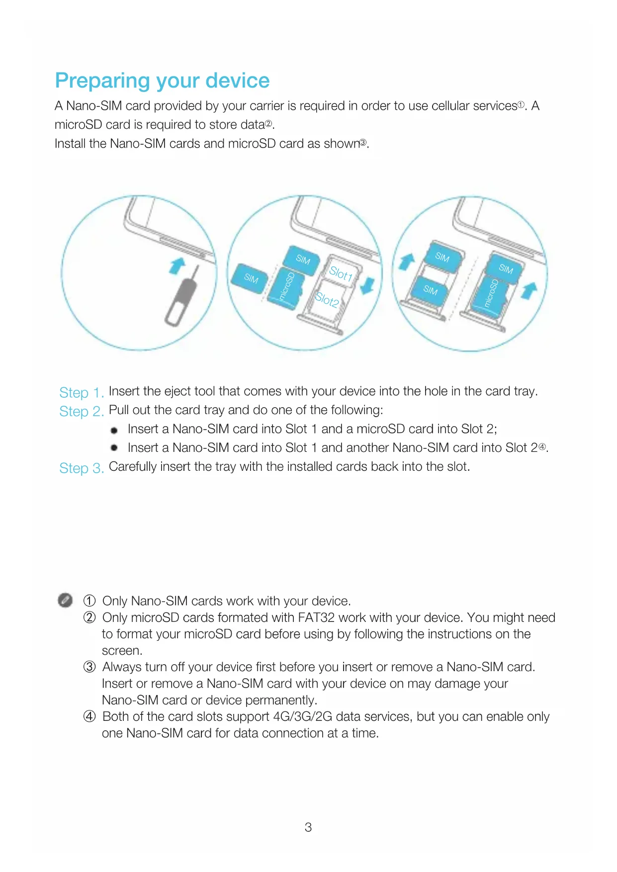 Install the Nano-SIM cards and microSD card as shown