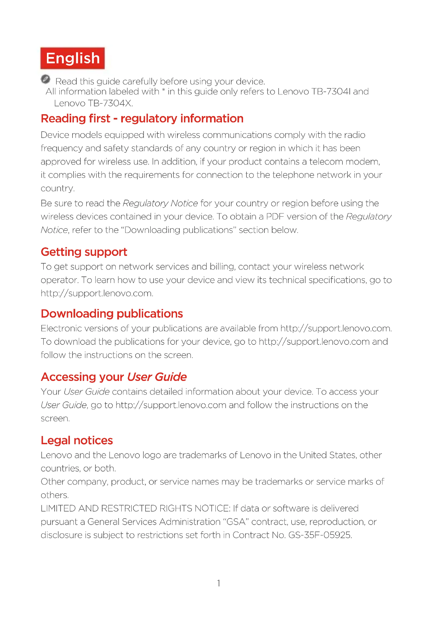 English/Français/Español Lenovo TAB 7 Essential Safety, Warranty & Quick Start Guide Lenovo TB-7304F Lenovo TB-7304I Lenovo TB-7304XContents English .............................................................................................................. 1 Français ............................................................................................................ 14 Español ............................................................................................................. 261 English Read this guide carefully before using your device. All information labeled with * in this guide only refers to Lenovo TB-7304I and Lenovo TB-7304X. Reading first - regulatory information Device models equipped with wireless communications comply with the radio frequency and safety standards of any country or region in which it has been approved for wireless use. In addition, if your product contains a telecom modem, it complies with the requirements for connection to the telephone network in your country. Be sure to read the Regulatory Notice for your country or region before using the wireless devices contained in your device. To obtain a PDF version of the Regulatory Notice, refer to the “Downloading publications” section below. Getting support To get support on network services and billing, contact your wireless network operator. To learn how to use your device and view its technical specifications, go to http://support.lenovo.com. Downloading publications Electronic versions of your publications are available from http://support.lenovo.com. To download the publications for your device, go to http://support.lenovo.com and follow the instructions on the screen. Accessing your User Guide Your User Guide contains detailed information about your device. To access your User Guide, go to http://support.lenovo.com and follow the instructions on the screen. Legal notices Lenovo and the Lenovo logo are trademarks of Lenovo in the United States, other countries, or both. Other company, product, or service names may be trademarks or service marks of others. LIMITED AND RESTRICTED RIGHTS NOTICE: If data or software is delivered pursuant a General Services Administration “GSA” contract, use, reproduction, or disclosure is subject to restrictions set forth in Contract No. GS-35F-05925.2 The WLAN version (Lenovo TB-7304F) does not have a Nano-SIM card tray. All pictures and illustrations in this document are for your reference only and may differ from the final product. Device overview Model Name Version Lenovo TB-7304F WLAN Lenovo TB-7304I WLAN + WCDMA Lenovo TB-7304X WLAN + LTE