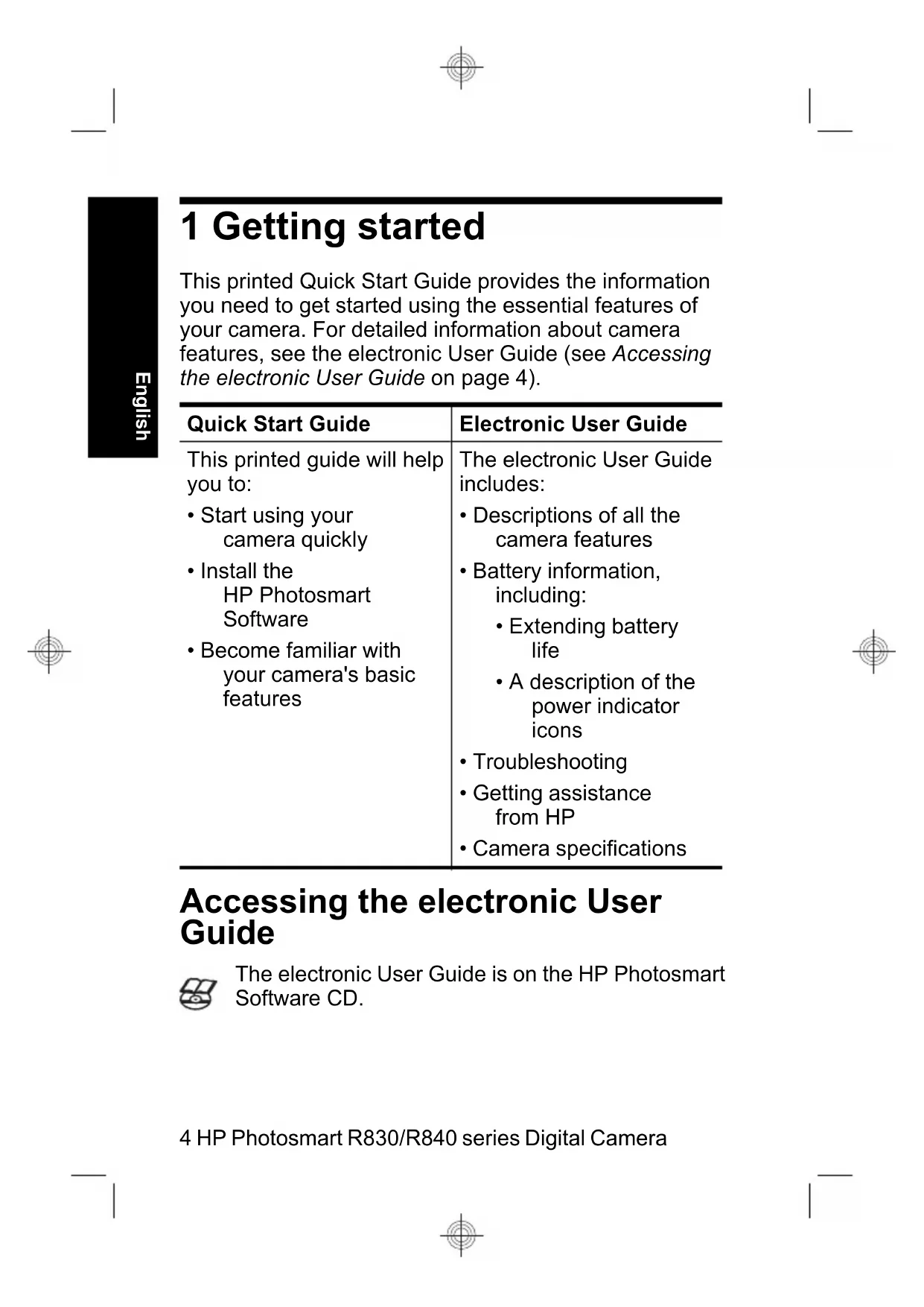 - Camera specifications Accessing the electronic User Guide The electronic User Guide is on the HP Photosmart Software CD. 4 HP Photosmart R830/R840 series Digital Camera EnglishTo view the User Guide: