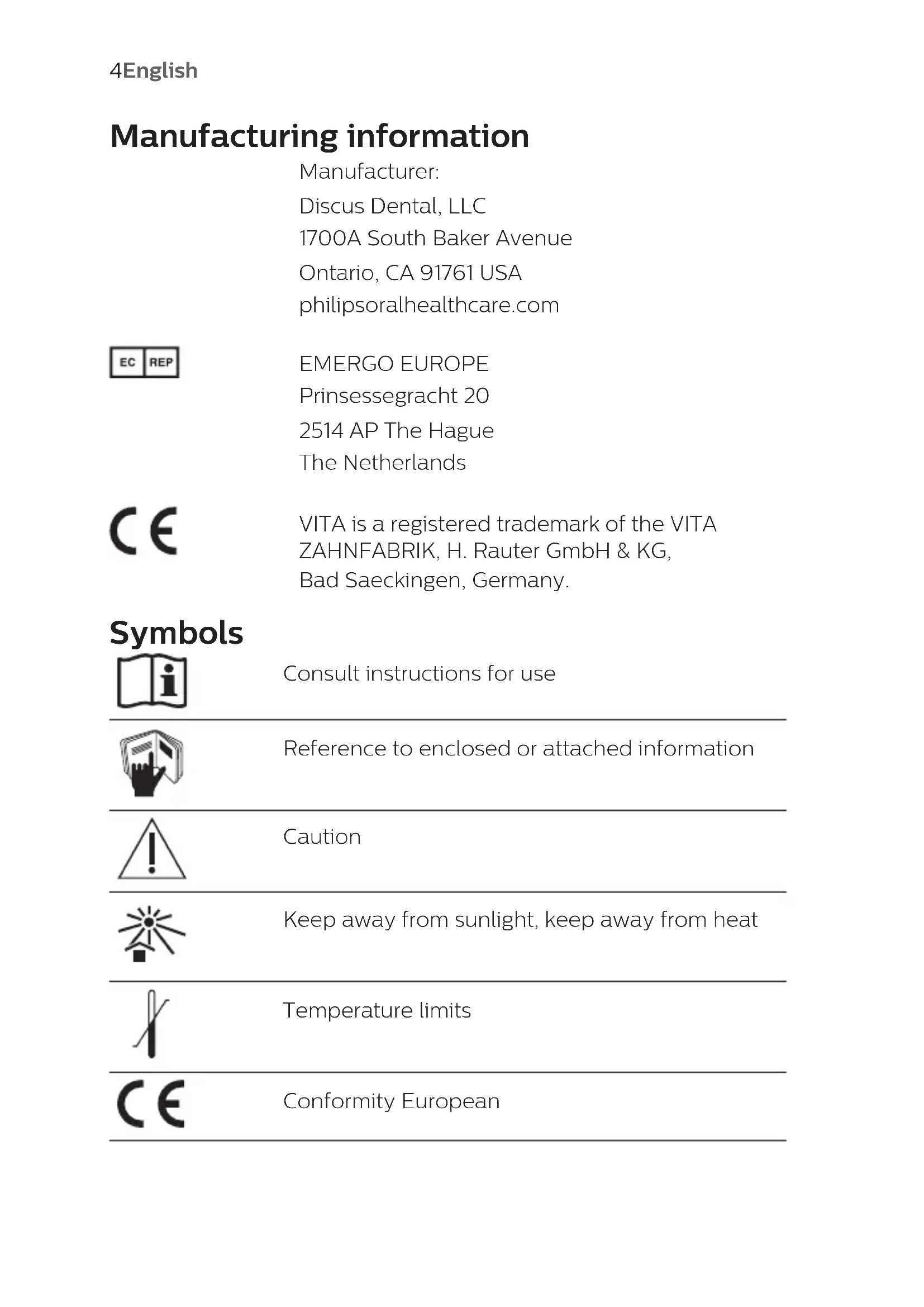 WhiteSpeed Light-Accelerated Tooth Whitening Procedure Kit WhiteSpeed Light-Accelerated Tooth Whitening Procedure Kit Instructions for useEnglish 6 Deutsch 19 Français 37 Hrvatski 59 Italiano 75 Română 89 Suomi 104 Български 120Manufacturing information Manufacturer: Discus Dental, LLC 1700A South Baker Avenue Ontario, CA 91761 USA philipsoralhealthcare.com EMERGO EUROPE Prinsessegracht 20 2514 AP The Hague The Netherlands VITA is a registered trademark of the VITA ZAHNFABRIK, H. Rauter GmbH & KG, Bad Saeckingen, Germany. Symbols Consult instructions for use Reference to enclosed or attached information Caution Keep away from sunlight, keep away from heat Temperature limits Conformity European 4 EnglishManufacturer Use by date Batch code Catalogue number Authorized in the European Community Do not re-use. This product is intended for use on a single patient during a single procedure. Keep refrigerated Important information Read and understand the information in these instructions for use and in the instructions for use provided with the Philips Zoom! Whitespeed Light-Accelerated Tooth Whitening Gel (whitening gel) prior to initiating whitening treatment. The whitening gel must be removed from refrigeration and warmed to room temperature so it will thicken before it is applied to the patient's teeth. Either: - Remove the syringe from refrigeration at least 6 hours before use (preferably the night before) or - If removed just prior to use, place the syringe in a cup of hot water (49 °C) for 10 minutes. Remove the syringe from the water and wait 5 minutes before extruding gel.