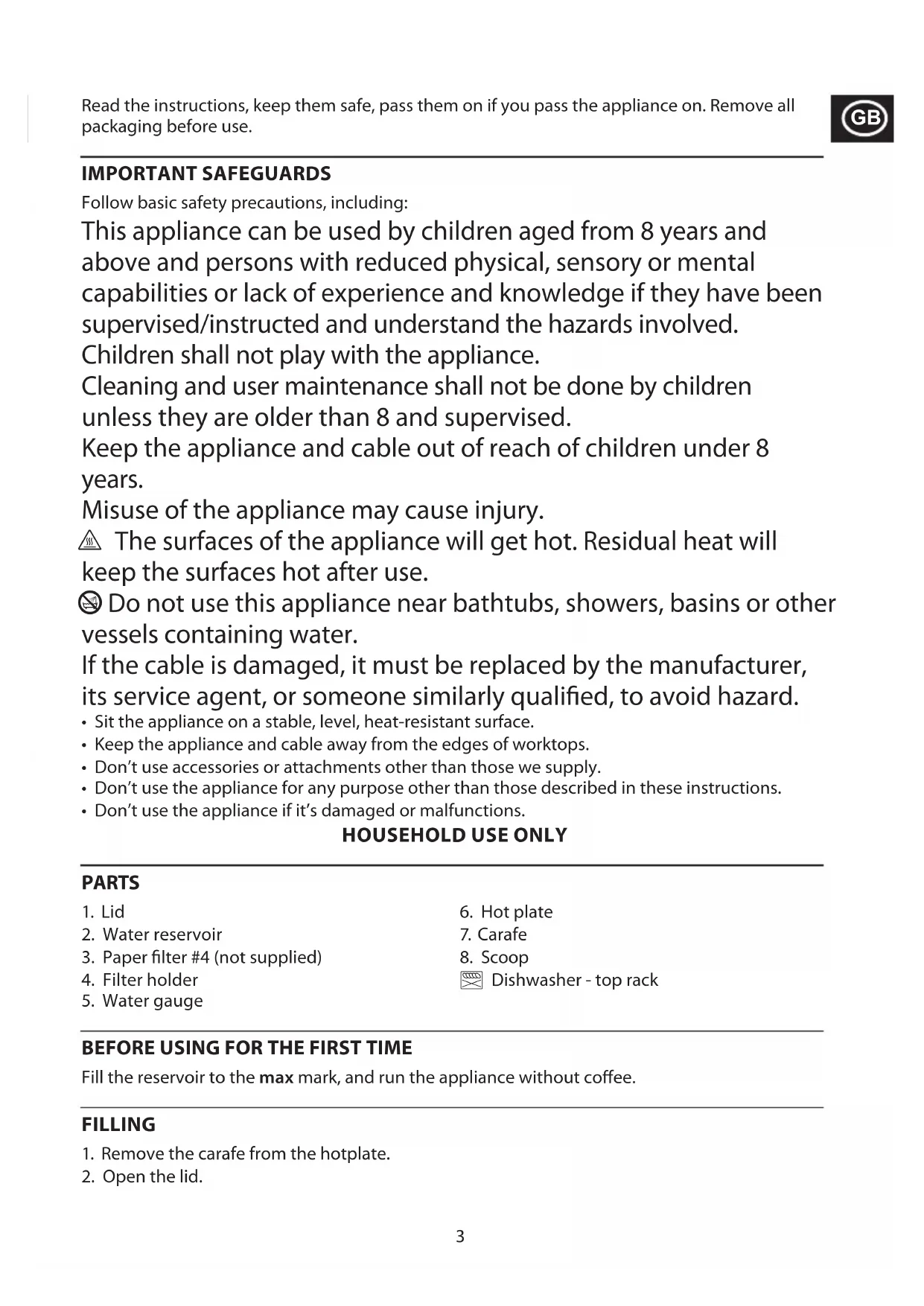 Read the instructions, keep them safe, pass them on if you pass the appliance on. Remove all packaging before use. IMPORTANT SAFEGUARDS Follow basic safety precautions, including: This appliance can be used by children aged from 8 years and above and persons with reduced physical, sensory or mental capabilities or lack of experience and knowledge if they have been supervised/instructed and understand the hazards involved. Children shall not play with the appliance. Cleaning and user maintenance shall not be done by children unless they are older than 8 and supervised. Keep the appliance and cable out of reach of children under 8 years. Misuse of the appliance may cause injury. h The surfaces of the appliance will get hot. Residual heat will keep the surfaces hot after use. b Do not use this appliance near bathtubs, showers, basins or other vessels containing water. If the cable is damaged, it must be replaced by the manufacturer, its service agent, or someone similarly qualied, to avoid hazard.