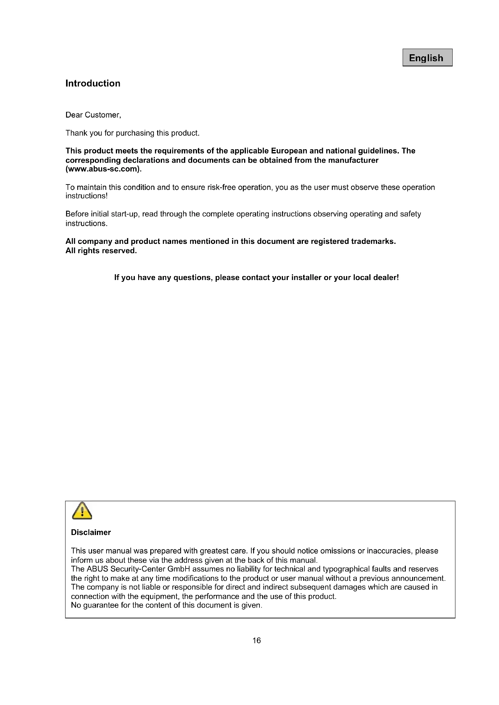 This product meets the requirements of the applicable European and national guidelines. The corresponding declarations and documents can be obtained from the manufacturer (www.abus-sc.com).