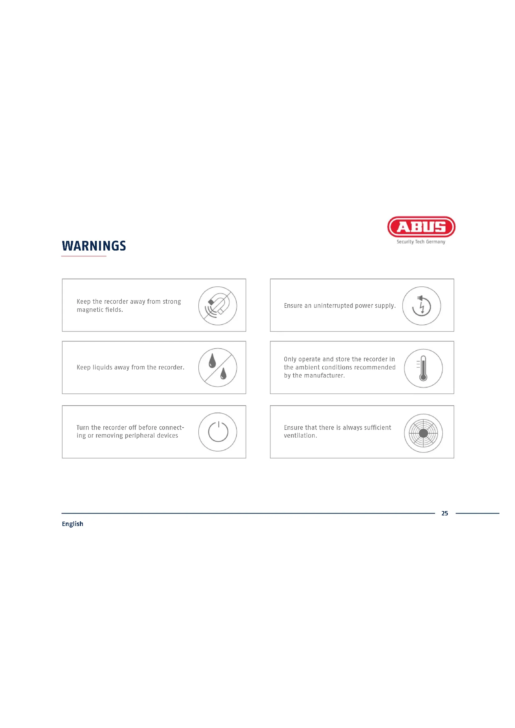 RECORDER This quick-start guide describes the initial installation steps for your IP recorder. More detailed information can be found in the user guide.23 English Dear Customer, Thank you for purchasing one of our products. This product complies with current domestic and European regulations. Conformity has been proven, and all related certications are available from the manufacturer on request: ABUS Security-Center GmbH & Co. KG, Linker Kreuthweg 5, 86444 Ang, GERMANY. To ensure that this standard is maintained and that safe operation is guaranteed, you are obliged to observe the stipulations set out in this user guide. Read the entire user manual before putting the product into operation, and pay attention to all operating instruc- tions and safety information. All company names and product descriptions are trademarks of the corresponding owner. All rights reserved. If you have any questions, please contact your specialist dealer.24 English