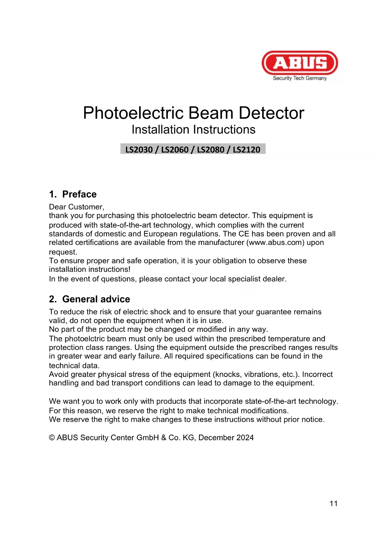 To reduce the risk of electric shock and to ensure that your guarantee remains valid, do not open the equipment when it is in use. No part of the product may be changed or modified in any way. The photoelctric beam must only be used within the prescribed temperature and protection class ranges. Using the equipment outside the prescribed ranges results in greater wear and early failure. All required specifications can be found in the technical data. Avoid greater physical stress of the equipment (knocks, vibrations, etc.). Incorrect handling and bad transport conditions can lead to damage to the equipment. We want you to work only with products that incorporate state-of-the-art technology. For this reason, we reserve the right to make technical modifications. We reserve the right to make changes to these instructions without prior notice. © ABUS Security Center GmbH & Co. KG, December 2024