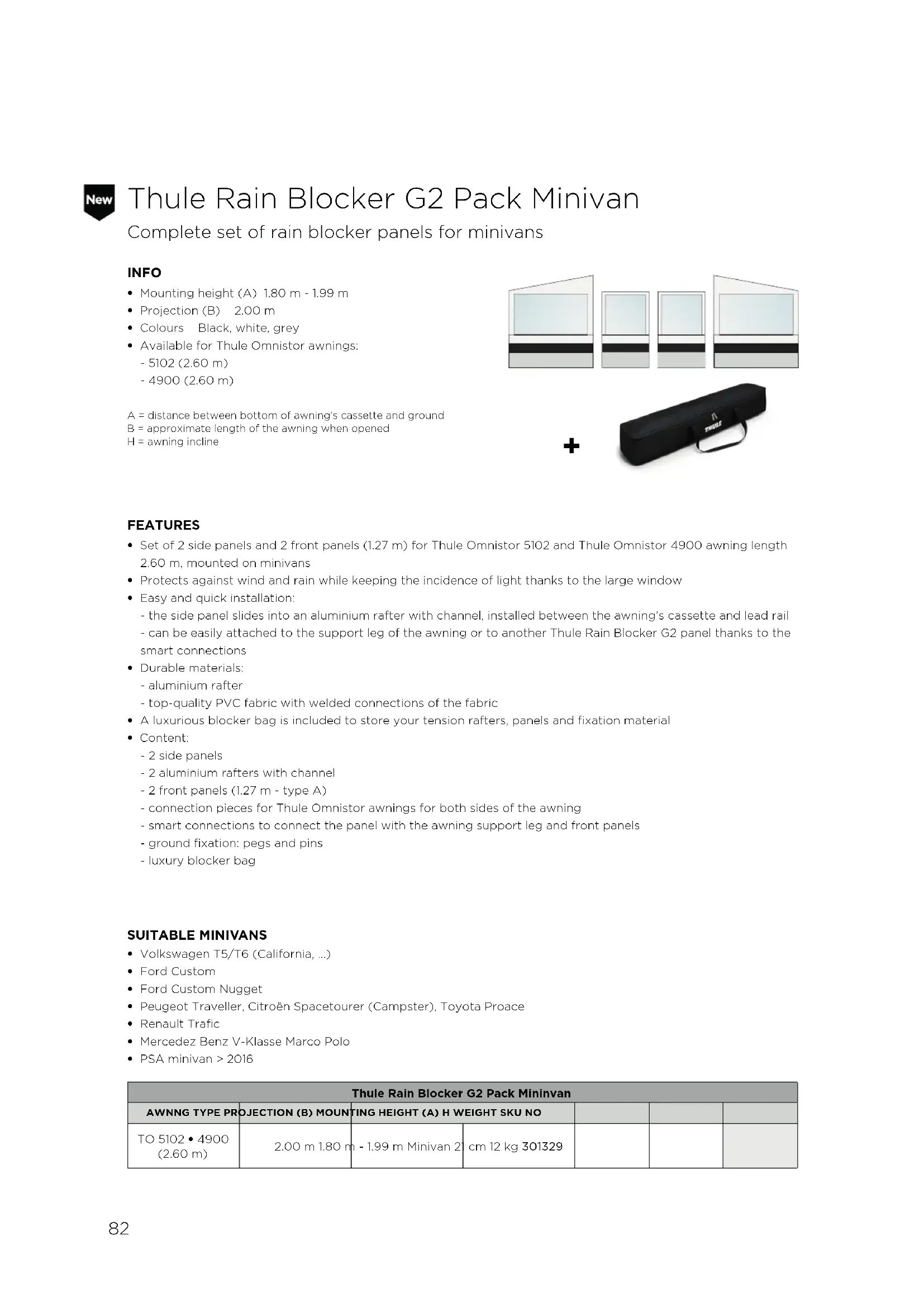 - Content: - 2 side panels - 2 aluminium rafters with channel - 2 front panels (1.27 m - type A) - connection pieces for Thule Omnistor awnings for both sides of the awning - smart connections to connect the panel with the awning support leg and front panels - ground fixation: pegs and pins - luxury blocker bag Thule Rain Blocker G2 Pack Mininvan AWNNG TYPE PROJECTION (B) MOUNTING HEIGHT (A) H WEIGHT SKU NO TO 5102 • 4900 (2.60 m)