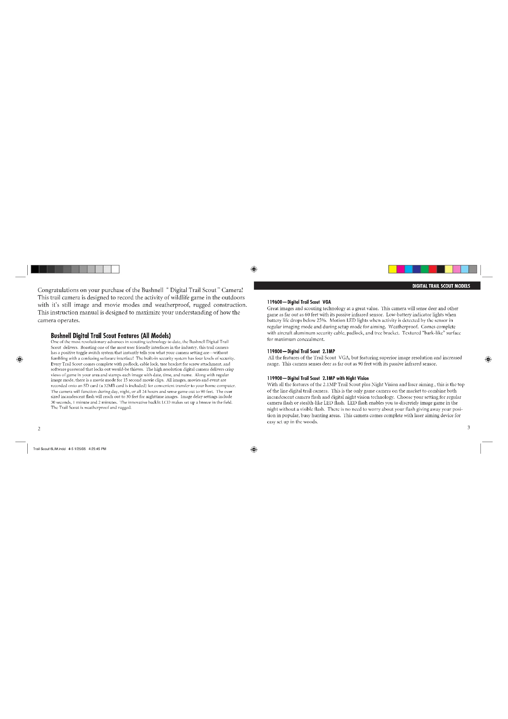 Trail Scout 6LIM.indd 2-3 1/25/05 4:25:45 PM119600—Digital Trail Scout VGA Great images and scouting technology at a great value. This camera will sense deer and other game as far out as 60 feet with its passive infrared sensor. Low-battery indicator lights when battery life drops below 25%. Motion LED lights when activity is detected by the sensor in regular imaging mode and during setup mode for aiming. Weatherproof. Comes complete with aircraft aluminum security cable, padlock, and tree bracket. Textured “bark-like” surface for maximum concealment. 119800—Digital Trail Scout 2.1MP All the features of the Trail Scout VGA, but featuring superior image resolution and increased range. This camera senses deer as far out as 90 feet with its passive infrared sensor. 119900—Digital Trail Scout 2.1MP with Night Vision With all the features of the 2.1MP Trail Scout plus Night Vision and laser aiming , this is the top of the line digital trail camera. This is the only game camera on the market to combine both incandescent camera flash and digital night vision technology. Choose your setting for regular camera flash or stealth-like LED flash. LED flash enables you to discretely image game in the night without a visible flash. There is no need to worry about your flash giving away your posi