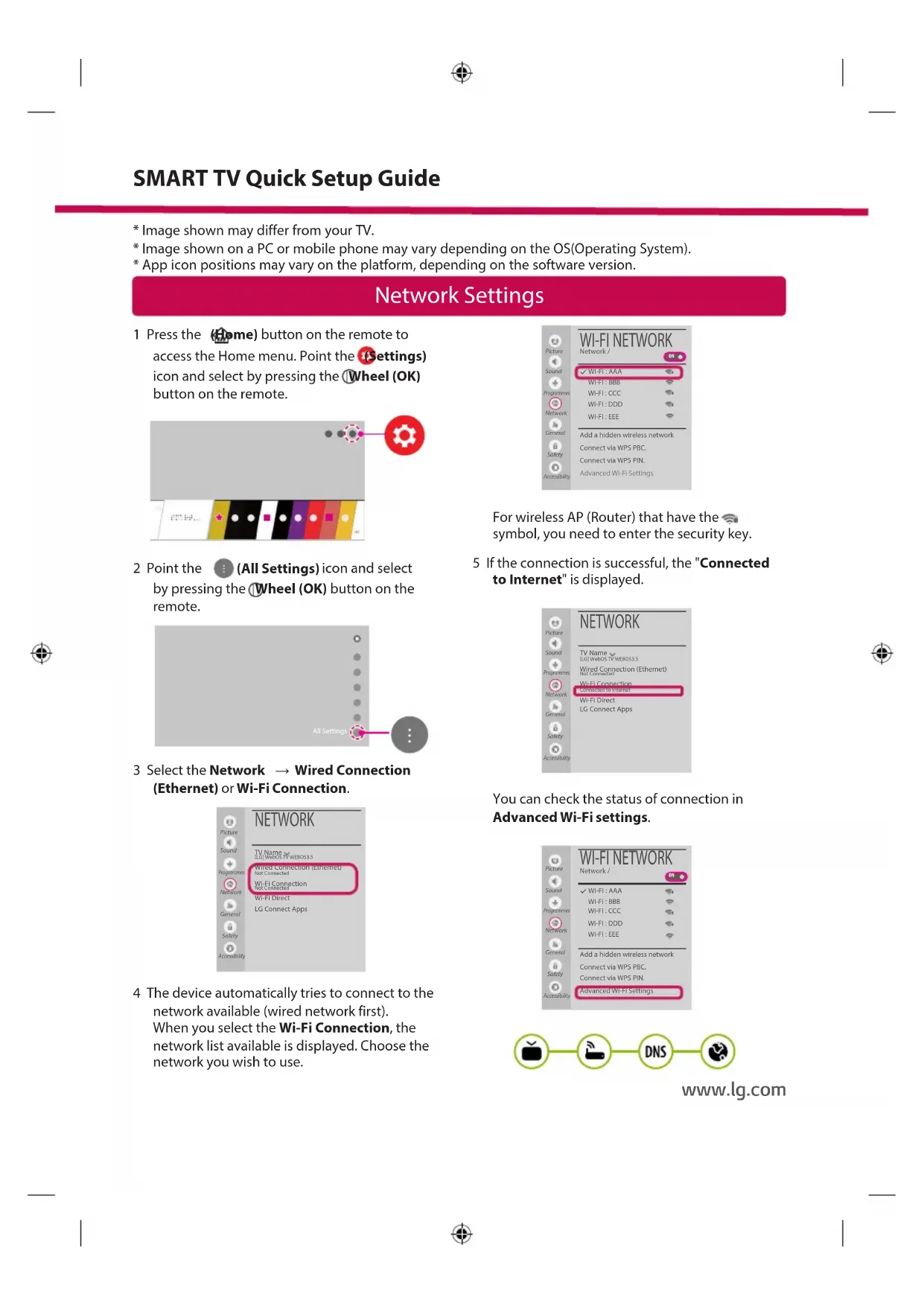 - App icon positions may vary on the platform, depending on the software version. SMART TV Quick Setup Guide www.lg.comTroubleshooting Network Problems 1 Press the (Home) button on the remote to access the Home menu. Point the (Settings) icon and select by pressing the Wheel (OK) button on the remote. 2 Point the