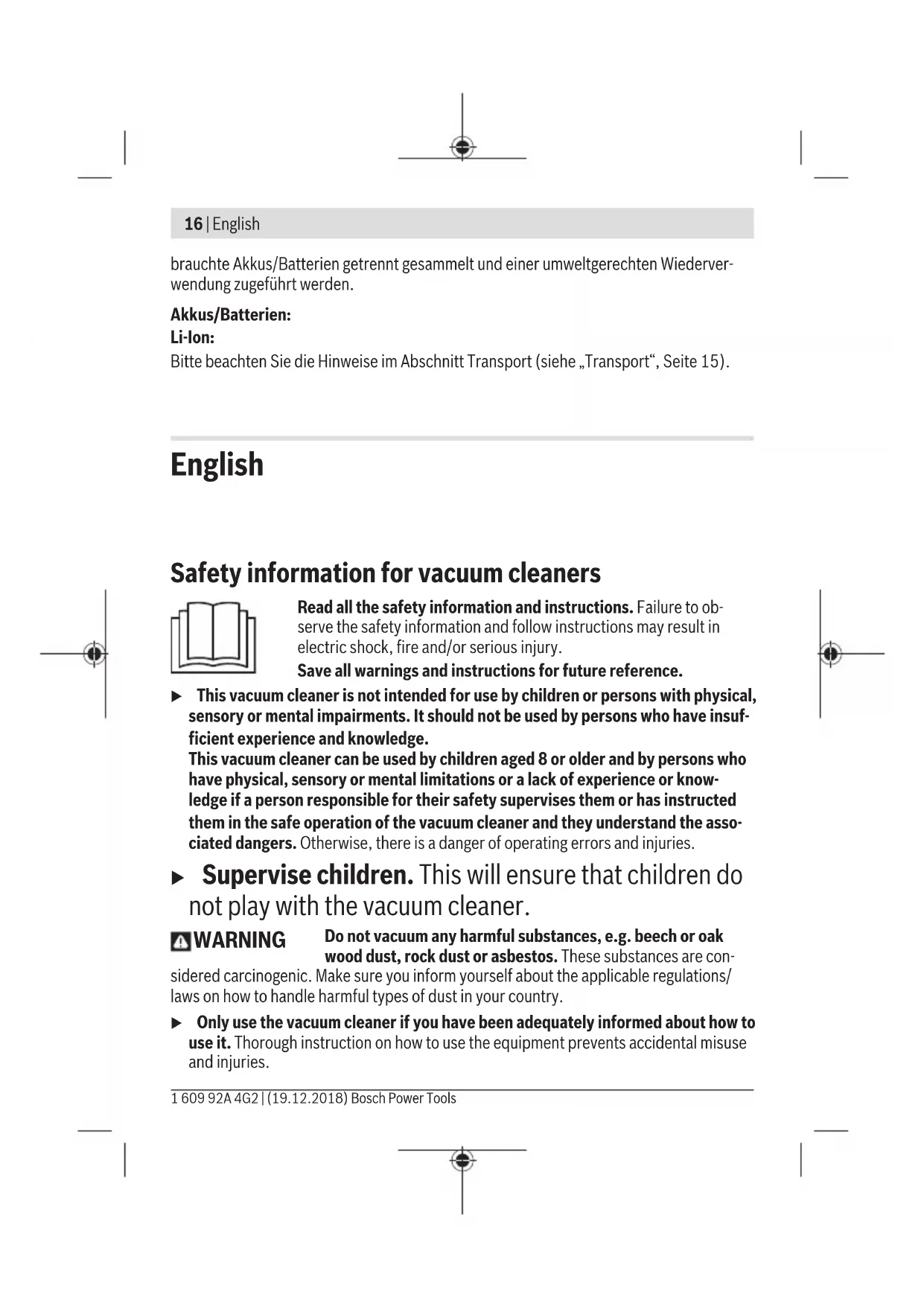and during storage °C -10 to +50 Recommended batteries 1 607 A35 08. Recommended power adaptor 1 600 A01 6A. A) Limited performance at temperatures <0°C Technical data determined using the battery that comes with the product. Fitting u Remove the battery before cleaning or performing maintenance on the dust ex- tractor, making tool adjustments, changing accessories or placing the dust ex- tractor in storage. This safety measure prevents the dust extractor from being star- ted accidentally. Battery charging (see figure A) u Use only the power adaptor listed in the technical data. Only this power adaptor is compatible with your vacuum cleaner's lithium-ion battery. Note: The battery is supplied partially charged. To ensure the maximum performance of the battery, use the power adaptor to fully charge the battery before first use. The lithium-ion battery can be charged at any time without reducing its service life. Inter- rupting the charging process does not damage the battery. The lithium-ion battery is protected against deep discharge by the Electronic Cell Protec- tion (ECP). A protective circuit switches the vacuum cleaner off when the battery is drained. u Do not continue to press the on/off button after the vacuum cleaner has auto- matically switched itself off. This can damage the battery. Bosch Power Tools 1 609 92A 4G2 | (19.12.2018)20 | English The battery features NTC temperature monitoring, which only permits charging in a tem- perature range between 10 °C and 35 °C. This achieves a long battery life. You can charge the battery (3) separately or in the vacuum cleaner. – Open the cover (6). – Connect the battery (3) to the power adaptor (10) using a USB cable (11). – Plug the power adaptor (10) into the plug socket. The charging process will begin. The battery charge indicator (4) indicates the char- ging progress. During the charging process, the vacuum cleaner is deactivated and cannot be used. If you are not planning to use the power tool again soon, disconnect the power adaptor (10) from the mains. Inserting and removing the battery (see figures B1–B2) u Do not use force to insert the battery. The battery is designed in such a way that it can only be inserted into the vacuum cleaner when it is in the right position. – Slide the battery (3) all the way into the battery bay (12). – To remove the battery (3), press the release button (13) on the battery and pull it out of the battery bay (12). Follow the instructions on correct disposal. Battery charge indicator The battery charge indicator (4) is automatically activated as soon as the battery (3) is moved. The battery charge indicator (4) goes out if the battery (3) is not moved for a few seconds. The battery charge indicator (4) is switched off when the vacuum cleaner is be- ing used. Charge Battery separate or in the vacuum cleaner (in mo- tion) Charging process (battery with connected power adaptor) 100% Green (continuous) Green (continuous) 100%−50% Green (continuous) Green (flashing) 50%−20% Yellow (continuous) Green (flashing) 20%−5% Red (continuous) Green (flashing) 1 609 92A 4G2 | (19.12.2018) Bosch Power ToolsEnglish | 21 Charge Battery separate or in the vacuum cleaner (in mo- tion) Charging process (battery with connected power adaptor) 5%−0% Red (flashing) Green (flashing) Note: If the battery (3) has been stored away and not been used for a long period of time, it is possible that the battery charge indicator (4) will not activate. This protects the battery (3) from deep discharge. Once the battery (3) is charged, the indicator will activate again. In this case, the charging time will increase. The battery charge indicator (4) goes out a few minutes after the battery (3) has been fully charged. Note: If the battery charge indicator (4) is flashing white, the temperature is outside the permitted ambient temperature range. The charging process begins automatically once the permitted temperature range has been reached again. The battery charge indicator (4) will flash green during the charging process. Fitting the Vacuuming Accessories The vacuum cleaner accessories can be directly connected with the dust container (8). – Insert the individual vacuum cleaner accessories firmly into the connection on the dust container(8) and into one another. Operation u Remove the battery before cleaning or performing maintenance on the dust ex- tractor, making tool adjustments, changing accessories or placing the dust ex- tractor in storage. This safety measure prevents the dust extractor from being star- ted accidentally. u Ensure that the flap of the USB Type-C