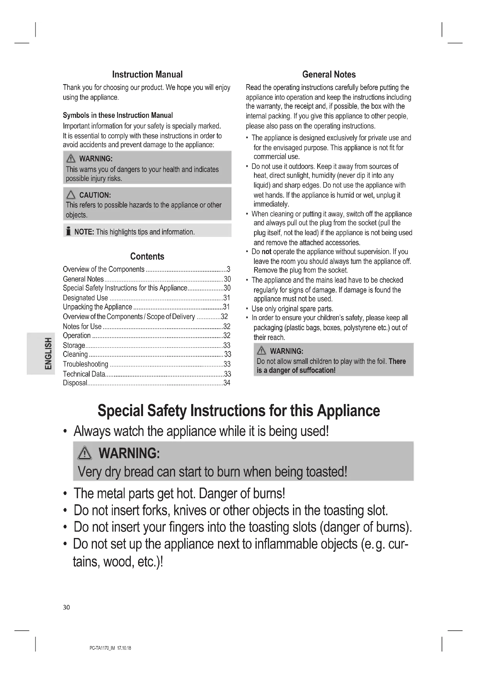 - Do not set up the appliance next to inammable objects (e. g. cur- tains, wood, etc.)!PC-TA1170_IM 17.10.18