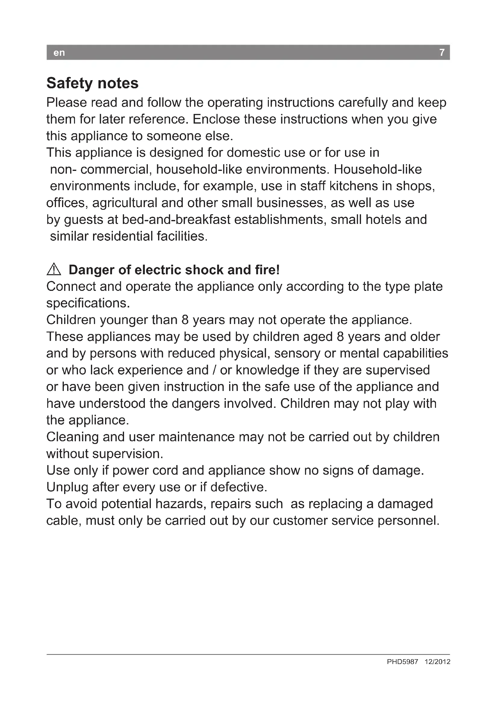 PHD5987 12/2012 7en Safety notes Please read and follow the operating instructions carefully and keep them for later reference. Enclose these instructions when you give this appliance to someone else. This appliance is designed for domestic use or for use in non- commercial, household-like environments. Household-like environments include, for example, use in staff kitchens in shops, ofces, agricultural and other small businesses, as well as use by guests at bed-and-breakfast establishments, small hotels and similar residential facilities.