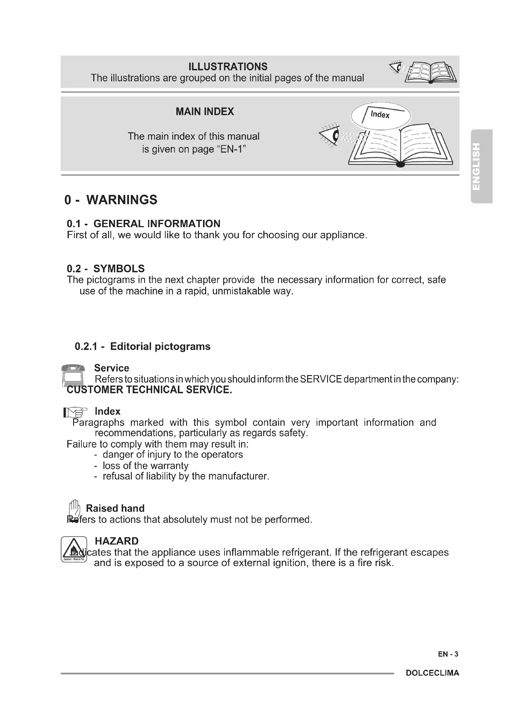 Service Refers to situations in which you should inform the SERVICE department in the company: CUSTOMER TECHNICAL SERVICE. Index Paragraphs marked with this symbol contain very important information and recommendations, particularly as regards safety. Failure to comply with them may result in: - danger of injury to the operators - loss of the warranty - refusal of liability by the manufacturer. Raised hand Refers to actions that absolutely must not be performed. HAZARD Indicatesthattheapplianceusesinammablerefrigerant.Iftherefrigerantescapes andisexposedtoasourceofexternalignition,thereisarerisk. Index MAIN INDEX The main index of this manual is given on page “EN-1” ILLUSTRATIONS The illustrations are grouped on the initial pages of the manualENGLISH EN - 4