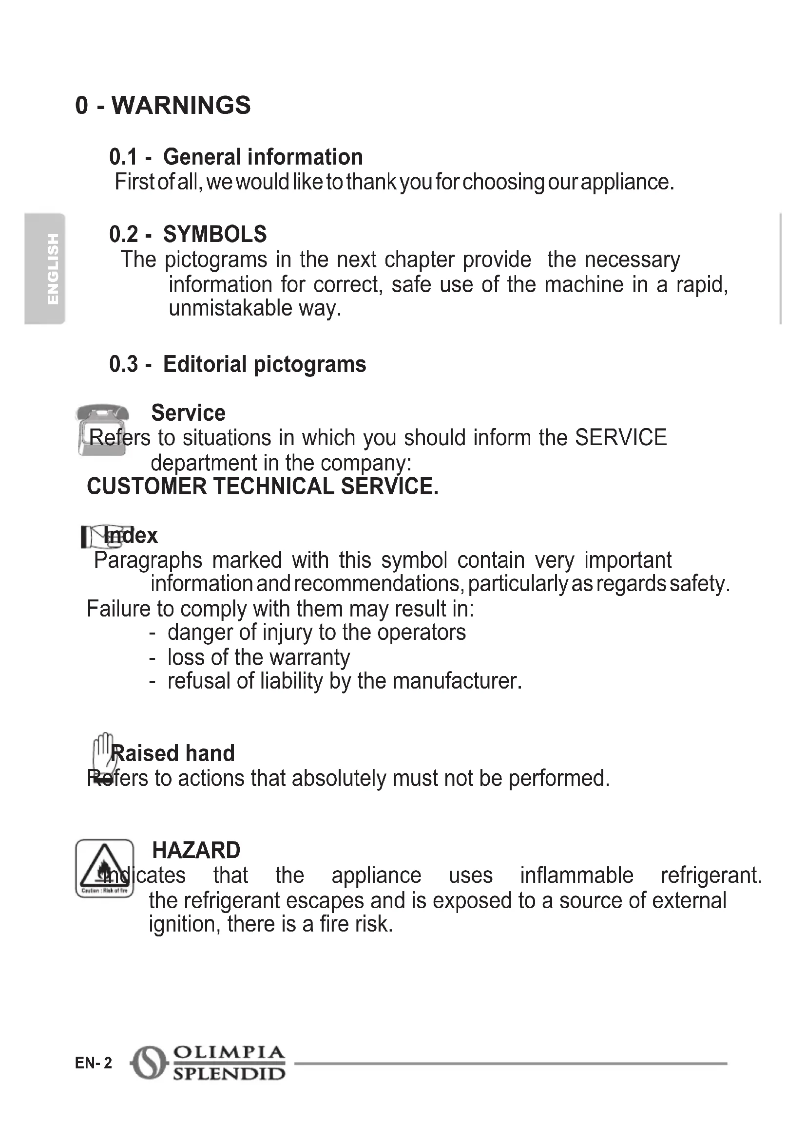 Service Refers to situations in which you should inform the SERVICE department in the company: CUSTOMER TECHNICAL SERVICE. Index Paragraphs marked with this symbol contain very important information and recommendations, particularly as regards safety. Failure to comply with them may result in: - danger of injury to the operators - loss of the warranty - refusal of liability by the manufacturer. Raised hand Refers to actions that absolutely must not be performed. HAZARD Indicates that the appliance uses inammable refrigerant. If the refrigerant escapes and is exposed to a source of external ignition,thereisarerisk.CALDORAD DIGITAL ENGLISH EN- 3