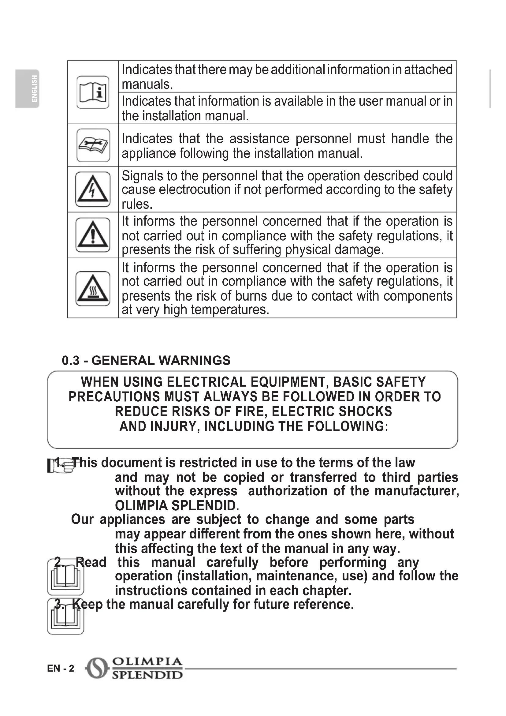 ENGLISH Indicates that there may be additional information in attached manuals. Indicates that information is available in the user manual or in the installation manual. Indicates that the assistance personnel must handle the appliance following the installation manual. Signals to the personnel that the operation described could cause electrocution if not performed according to the safety rules.