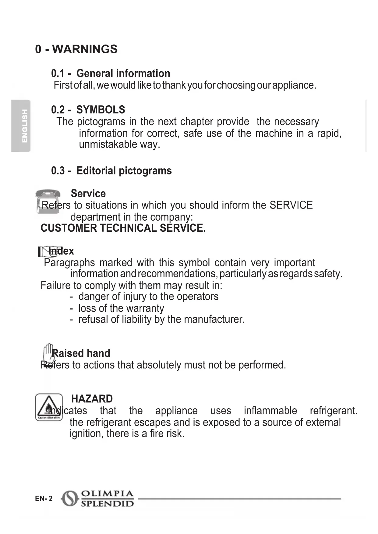 Service Refers to situations in which you should inform the SERVICE department in the company: CUSTOMER TECHNICAL SERVICE. Index Paragraphs marked with this symbol contain very important information and recommendations, particularly as regards safety. Failure to comply with them may result in: - danger of injury to the operators - loss of the warranty - refusal of liability by the manufacturer. Raised hand Refers to actions that absolutely must not be performed. HAZARD Indicates that the appliance uses inammable refrigerant. If the refrigerant escapes and is exposed to a source of external ignition,thereisarerisk.CALDOSILENT ENGLISH EN- 3