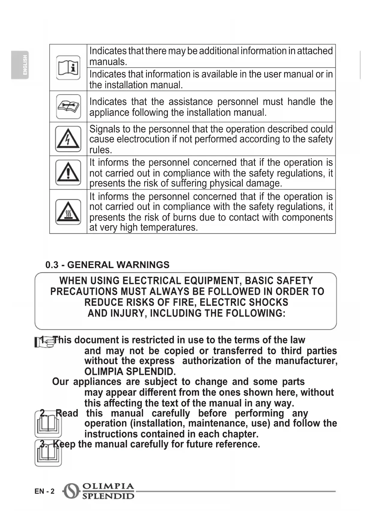 ENGLISH Indicates that there may be additional information in attached manuals. Indicates that information is available in the user manual or in the installation manual. Indicates that the assistance personnel must handle the appliance following the installation manual. Signals to the personnel that the operation described could cause electrocution if not performed according to the safety rules.