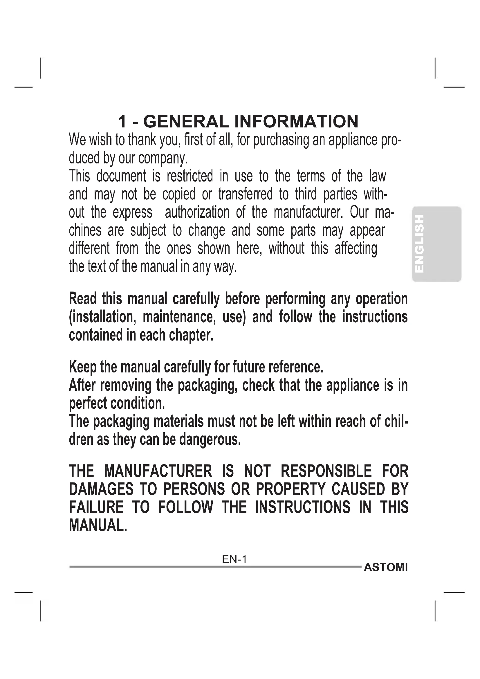 ASTOMIENGLISH EN- The manufacturer reserves the right to make any changes it deems advisable to its models, although the essential features described in this manual remain the same.